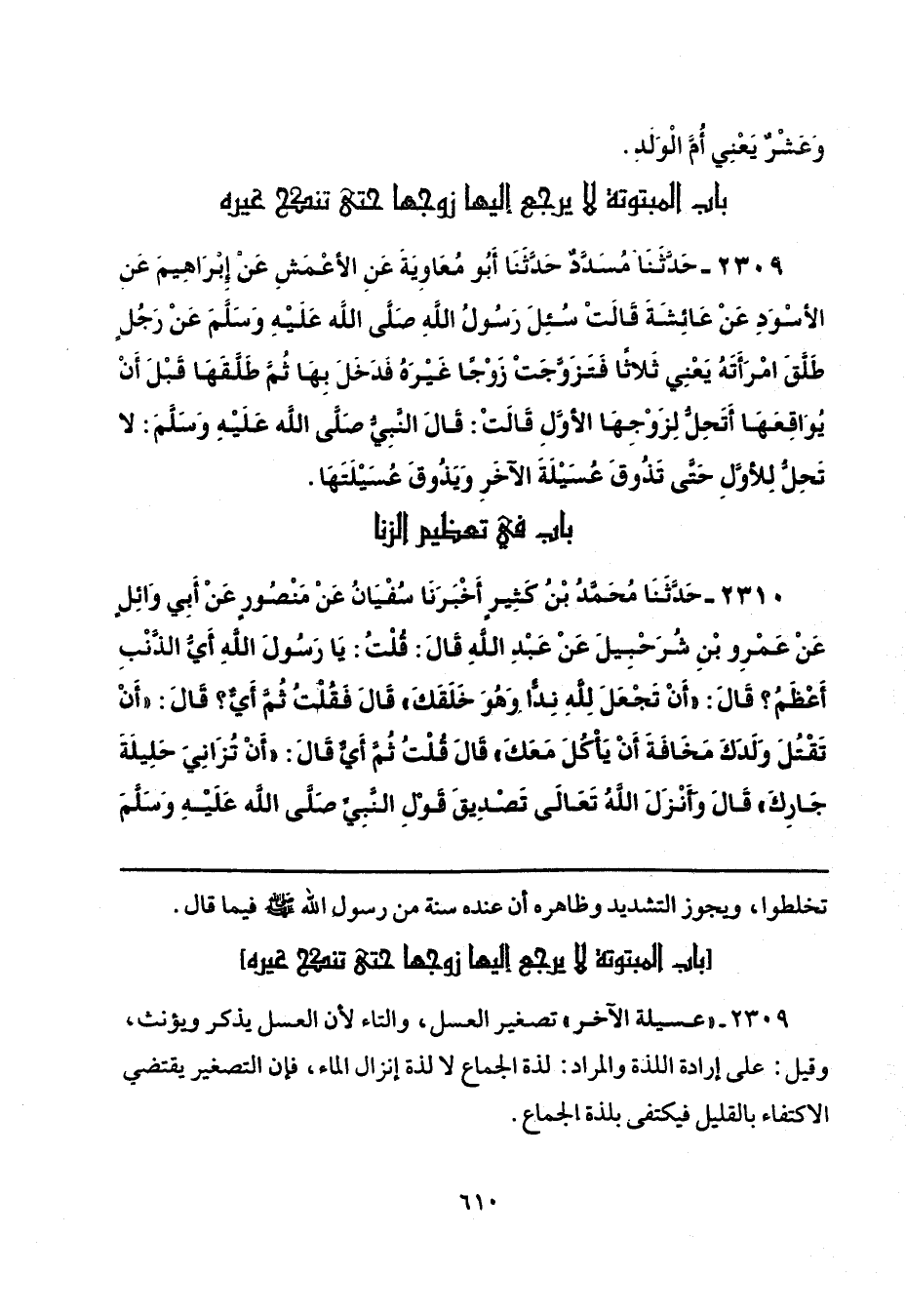 2309 - حَدَّثَنَا مُسَدَّدٌ، حَدَّثَنَا أَبُو مُعَاوِيَةَ، عَنِ الْأَعْمَشِ، عَنْ إِبْرَاهِيمَ، عَنِ الْأَسْوَدِ، عَنْ عَائِشَةَ قَالَتْ: سُئِلَ رَسُولُ اللَّهِ صَلَّى اللهُ عَلَيْهِ وَسَلَّمَ، عَنْ رَجُلٍ طَلَّقَ امْرَأَتَهُ - يَعْنِي ثَلَاثًا - فَتَزَوَّجَتْ زَوْجًا غَيْرَهُ، فَدَخَلَ بِهَا، ثُمَّ طَلَّقَهَا قَبْلَ أَنْ يُوَاقِعَهَا أَتَحِلُّ لِزَوْجِهَا الْأَوَّلِ؟ قَالَتْ: قَالَ النَّبِيُّ صَلَّى اللهُ عَلَيْهِ وَسَلَّمَ: «لَا تَحِلُّ لِلْأَوَّلِ حَتَّى تَذُوقَ عُسَيْلَةَ الْآخَرِ، وَيَذُوقَ عُسَيْلَتَهَا».