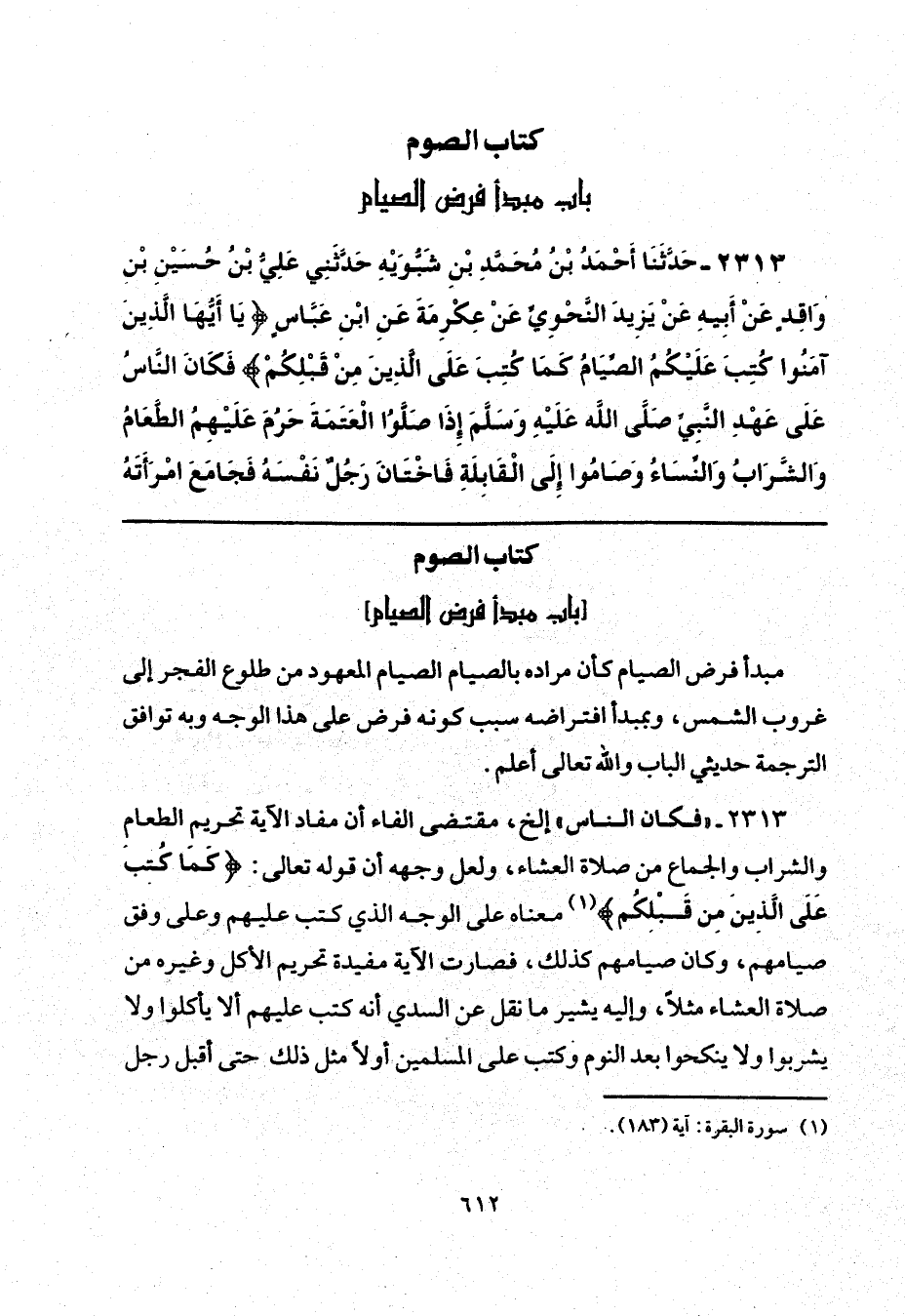 2313 - " فكان الناس" إلخ، مقتضى الفاء أن مفاد الآية تحريم الطعام والشراب والجماع من صلاة العشاء، ولعل وجهه أن قوله تعالى: {كمَا كتب عَلى الذين مِن قَبْلِكُم} (¬1) معناه على الوجه الذي كتب عيهم وعلى وفق صيامهم، وكان صيامهم كذلك، فصارت الآية مفيدة تحريم الأكل وغيره من صلاة العشاء مثلًا، وإليه يشير ما نقل عن السدي أنه كتب عليهم ألا يأكلوا ولا يشربوا ولا ينكحوا بعد النوم وكتب على المسلمين أولًا مثل ذلك حتى أقبل رجل