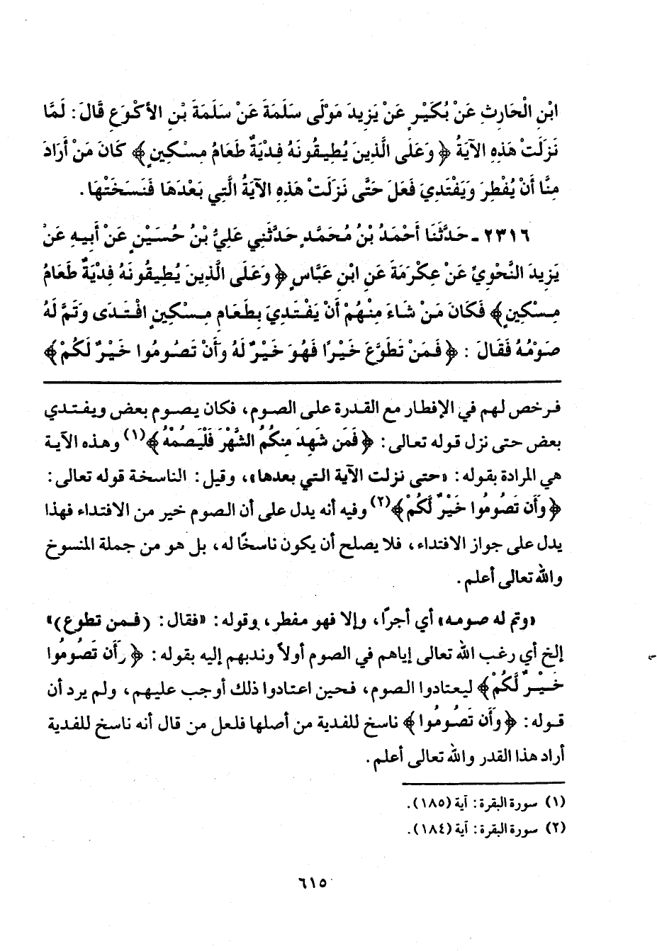 2316 - حَدَّثَنَا أَحْمَدُ بْنُ مُحَمَّدٍ، حَدَّثَنِي عَلِيُّ بْنُ حُسَيْنٍ، عَنْ أَبِيهِ، عَنْ يَزِيدَ النَّحْوِيِّ، عَنْ عِكْرَمَةَ، عَنْ ابْنِ عَبَّاسٍ: {وَعَلَى الَّذِينَ يُطِيقُونَهُ فِدْيَةٌ طَعَامُ مِسْكِينٍ} [البقرة: 184]، «فَكَانَ مَنْ شَاءَ مِنْهُمْ أَنْ يَفْتَدِيَ بِطَعَامِ مِسْكِينٍ افْتَدَى وَتَمَّ لَهُ صَوْمُهُ»، فَقَالَ: {فَمَنْ تَطَوَّعَ خَيْرًا فَهُوَ خَيْرٌ لَهُ وَأَنْ تَصُومُوا خَيْرٌ لَكُمْ} [البقرة: 184]،