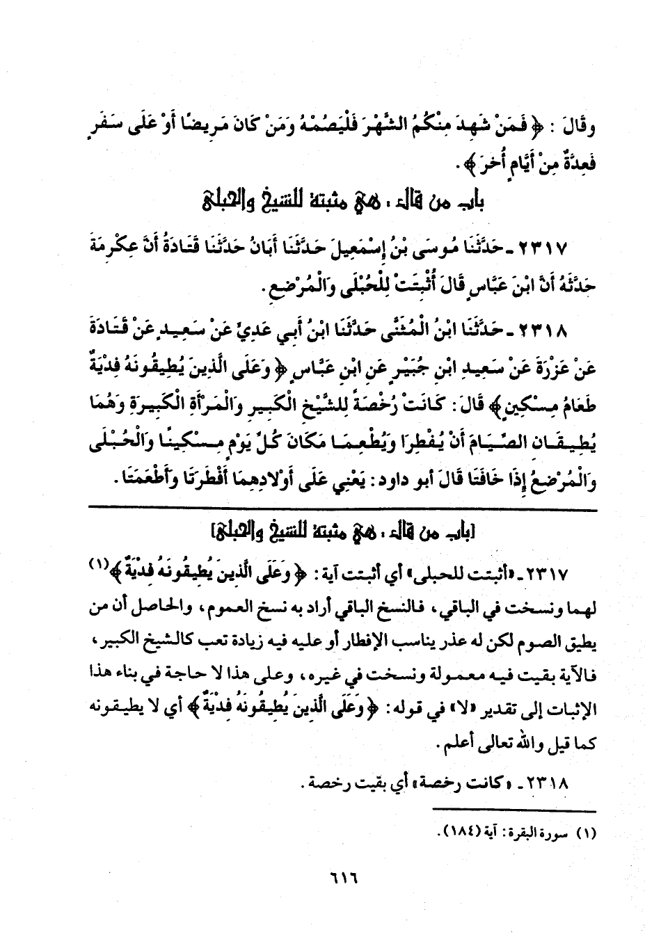 2317 - "أثبتت للحبلى" أي أثبتت آية: {وَعَلي الذينَ يطيقُونهُ فدْيَة} (¬1) لهما ونسخت في الباقي فالنسخ الباقي أراد به نسخ العموم، والحاصل أن من يطيق الصوم لكن له عذر يناسب الإفطار أو عليه فيه زيادة تعب كالشيخ الكبير، فالآية بقيت فيه معمولة ونسخت في غيره، وعلى هذا لا حاجة في بناء هذا الإثبات إلى تقدير "لا" في قوله: {وعلى الذِينَ يُطيقُونهُ فدْية} أي لا يطيقونه كما قيل والله تعالى أعلم.