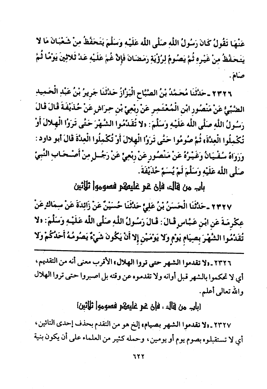 2326 - حَدَّثَنَا مُحَمَّدُ بْنُ الصَّبَّاحِ الْبَزَّازُ، حَدَّثَنَا جَرِيرُ بْنُ عَبْدِ الْحَمِيدِ الضَّبِّيُّ، عَنْ مَنْصُورِ بْنِ الْمُعْتَمِرِ، عَنْ رِبْعِيِّ بْنِ حِرَاشٍ، عَنْ حُذَيْفَةَ قَالَ: قَالَ رَسُولُ اللَّهِ صَلَّى اللهُ عَلَيْهِ وَسَلَّمَ: «لَا تُقَدِّمُوا الشَّهْرَ حَتَّى تَرَوُا الْهِلَالَ، أَوْ تُكْمِلُوا الْعِدَّةَ، ثُمَّ صُومُوا حَتَّى تَرَوُا الْهِلَالَ، أَوْ تُكْمِلُوا الْعِدَّةَ»، قَالَ أَبُو دَاوُدَ: وَرَوَاهُ سُفْيَانُ، وَغَيْرُهُ عَنْ مَنْصُورٍ، عَنْ رِبْعِيٍّ، عَنْ رَجُلٍ مِنْ أَصْحَابِ النَّبِيِّ صَلَّى اللهُ عَلَيْهِ وَسَلَّمَ لَمْ يُسَمِّ حُذَيْفَةَ.