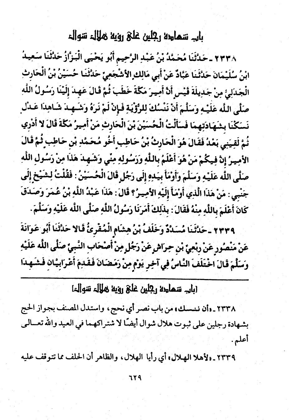 2338 - حَدَّثَنَا مُحَمَّدُ بْنُ عَبْدِ الرَّحِيمِ أَبُو يَحْيَى الْبَزَّازُ، حَدَّثَنَا سَعِيدُ بْنُ سُلَيْمَانَ، حَدَّثَنَا عَبَّادٌ، عَنْ أَبِي مَالِكٍ الْأَشْجَعِيِّ، حَدَّثَنَا حُسَيْنُ بْنُ الْحَارِثِ الْجَدَلِيُّ، مِنْ جَدِيلَةَ قَيْسٍ، أَنَّ أَمِيرَ مَكَّةَ خَطَبَ، ثُمَّ قَالَ: «عَهِدَ إِلَيْنَا رَسُولُ اللَّهِ صَلَّى اللهُ عَلَيْهِ وَسَلَّمَ أَنْ نَنْسُكَ لِلرُّؤْيَةِ، فَإِنْ لَمْ نَرَهُ، وَشَهِدَ شَاهِدَا عَدْلٍ نَسَكْنَا بِشَهَادَتِهِمَا»، فَسَأَلْتُ الْحُسَيْنَ بْنَ الْحَارِثِ مَنْ أَمِيرُ مَكَّةَ، قَالَ: لَا أَدْرِي، ثُمَّ لَقِيَنِي بَعْدُ، فَقَالَ: هُوَ الْحَارِثُ بْنُ حَاطِبٍ أَخُو مُحَمَّدِ بْنِ حَاطِبٍ، ثُمَّ قَالَ الْأَمِيرُ: إِنَّ فِيكُمْ مَنْ هُوَ أَعْلَمُ بِاللَّهِ وَرَسُولِهِ مِنِّي، وَشَهِدَ هَذَا مِنْ رَسُولِ اللَّهِ صَلَّى اللهُ عَلَيْهِ وَسَلَّمَ، وَأَوْمَأَ بِيَدِهِ إِلَى رَجُلٍ، قَالَ الْحُسَيْنُ: فَقُلْتُ لِشَيْخٍ إِلَى جَنْبِي مَنْ هَذَا الَّذِي أَوْمَأَ إِلَيْهِ الْأَمِيرُ؟ قَالَ: هَذَا عَبْدُ اللَّهِ بْنُ عُمَرَ، وَصَدَقَ كَانَ أَعْلَمَ بِاللَّهِ مِنْهُ، فَقَالَ: «بِذَلِكَ أَمَرَنَا رَسُولُ اللَّهِ صَلَّى اللهُ عَلَيْهِ وَسَلَّمَ».