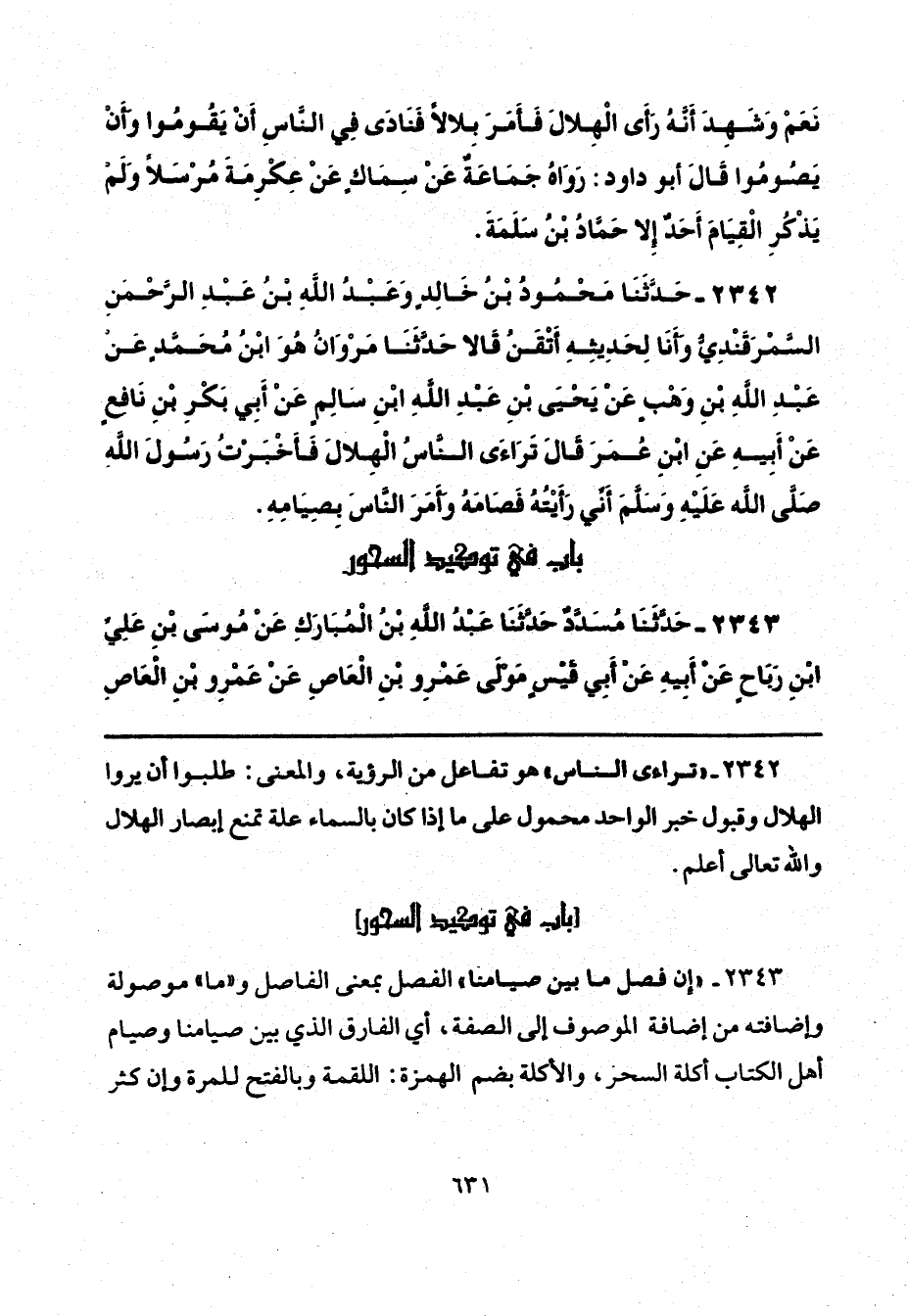 2342 - "تراءى الناس" هو تفاعل من الرؤية، والمعنى: طلبوا أن يروا الهلال وقبول خبر الواحد محمول على ما إذا كان بالسماء علة تمنع إبصار الهلال والله تعالى أعلم.