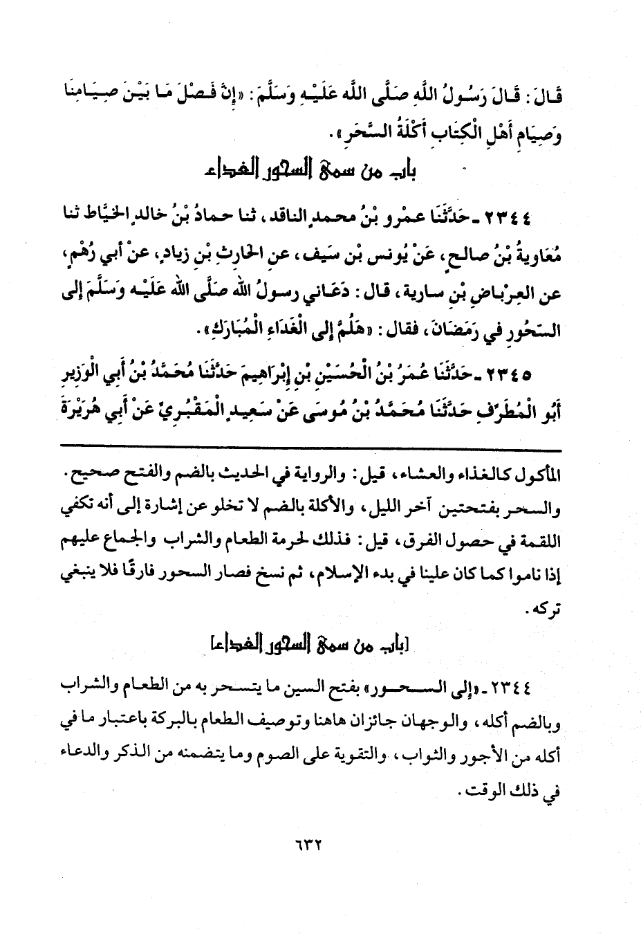 2344 - "إِلى السحور" بفتح السين ما يتسحر به من الطعام والشراب وبالضم أكله، والوجهان جائزان هاهنا وتوصيف الطعام بالبركة باعتبار ما في أكله من الأجور والثواب، والتقوية على الصوم وما يتضمنه من الذكر والدعاء في ذلك الوقت.
