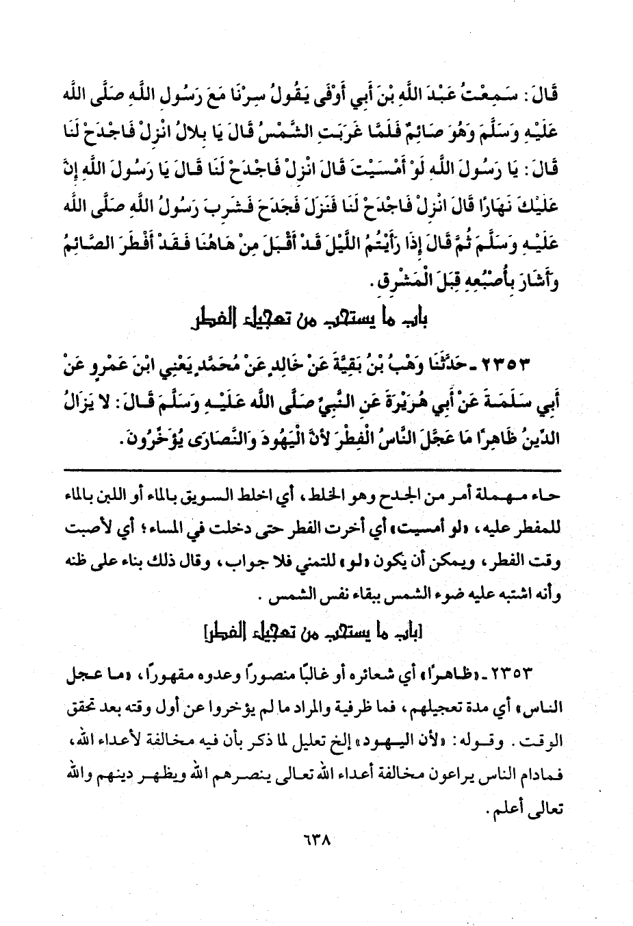 2353 - حَدَّثَنَا وَهْبُ بْنُ بَقِيَّةَ، عَنْ خَالِدٍ، عَنْ مُحَمَّدٍ يَعْنِي ابْنَ عَمْرٍو، عَنْ أَبِي سَلَمَةَ، عَنْ أَبِي هُرَيْرَةَ، عَنِ النَّبِيِّ صَلَّى اللهُ عَلَيْهِ وَسَلَّمَ قَالَ: «لَا يَزَالُ الدِّينُ ظَاهِرًا مَا عَجَّلَ النَّاسُ الْفِطْرَ، لِأَنَّ الْيَهُودَ، وَالنَّصَارَى يُؤَخِّرُونَ».