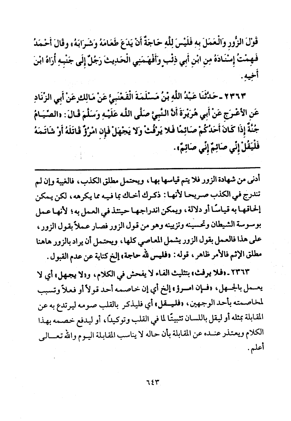 2363 - "فلا يرفث" بتثليث الفاء لا يفحش في الكلام، و"لا يجهل" أي لا يعمل بالجهل، "فإن امرؤ" إلخ أي إن خاصمه أحد قولًا أو فعلًا وتسبب لمخاصمته بأحد الوجهين، "فليقل" أي فليذكر بالقلب صومه ليرتدع به عن المقابلة بمثله أو ليقل باللسان تثبيتًا لما في التقلب وتوكيدًا، أو ليدفع خصمه بهذا الكلام ويعتذر عنده عن المقابلة بأن حاله لا يناسب المقابلة اليوم والله تعالى أعلم.