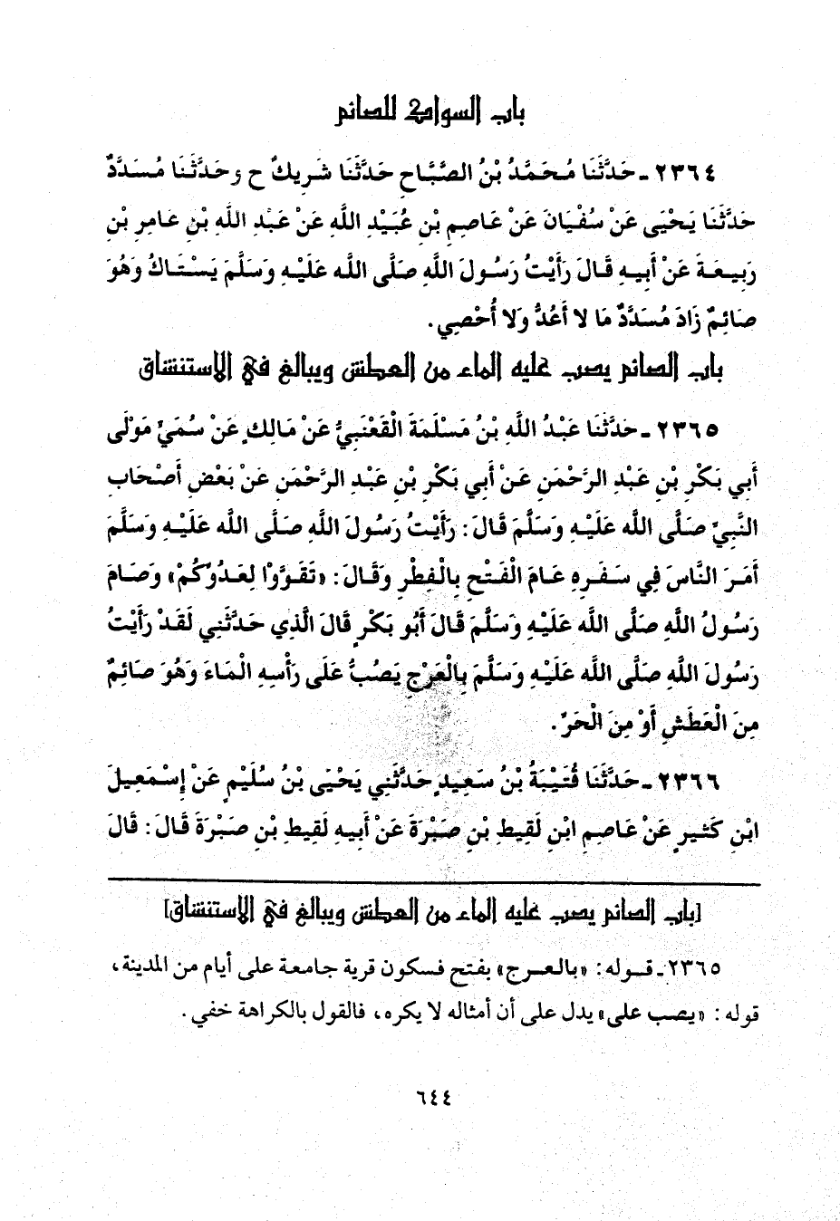 2364 - حَدَّثَنَا مُحَمَّدُ بْنُ الصَّبَّاحِ، حَدَّثَنَا شَرِيكٌ، ح وحَدَّثَنَا مُسَدَّدٌ، حَدَّثَنَا يَحْيَى، عَنْ سُفْيَانَ، عَنْ عَاصِمِ بْنِ عُبَيْدِ اللَّهِ، عَنْ عَبْدِ اللَّهِ بْنِ عَامِرِ بْنِ رَبِيعَةَ، عَنْ أَبِيهِ، قَالَ: رَأَيْتُ رَسُولَ اللَّهِ صَلَّى اللهُ عَلَيْهِ وَسَلَّمَ: «يَسْتَاكُ وَهُوَ صَائِمٌ»، زَادَ مُسَدَّدٌ مَا لَا أَعُدُّ، وَلَا أُحْصِي.