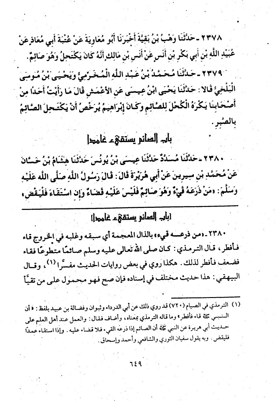 (¬1) الترمذي في الصيام (720) قد روي ذلك عن أبي الدرداء وثبوان وفضالة بن عبيد بلفظ: "أن النبي - صلى الله عليه وسلم - قاء فأفطر وما قاله الترمذي بمعناه، وأضاف فقال: والعمل عند أهل العلم على وحديث أبي هريرة عن النبي - صلى الله عليه وسلم - أن الصائم إذا ذرعه القيء فلا قضاء عليه. وإذا استقاء عمدًا فليقض. وبه يقول سفيان الثوري والشافعي وأحمد وإسحاق.