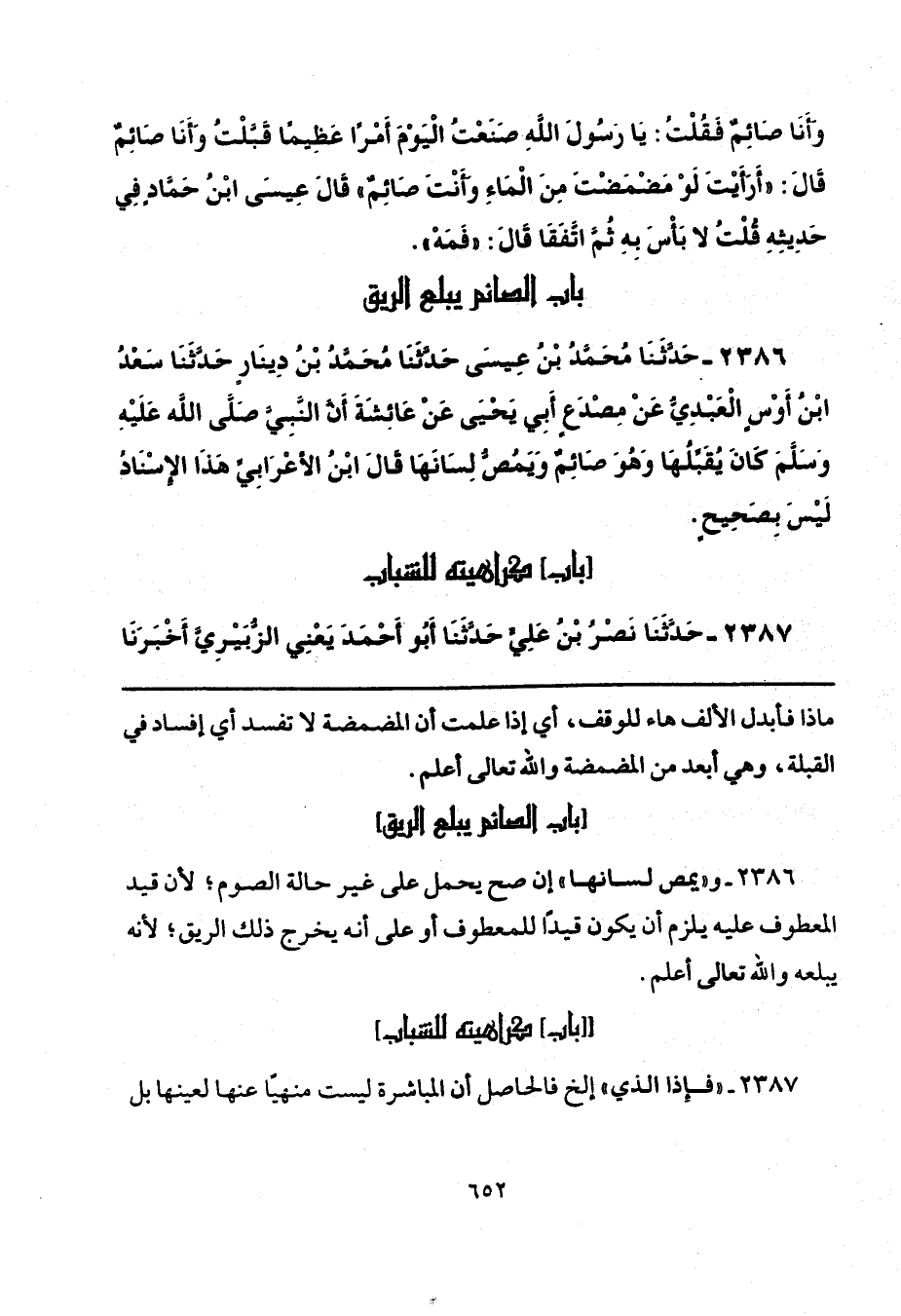 2386 - و"يمص لسانها" إن صح يحمل على غير حالة الصوم؛ لان قيد المعطوف عليه يلزم أن يكون قيدًا للمعطوف أو على أنَّه يخرج ذلك الريق؛ لأنه يبلعه والله تعالى أعلم.