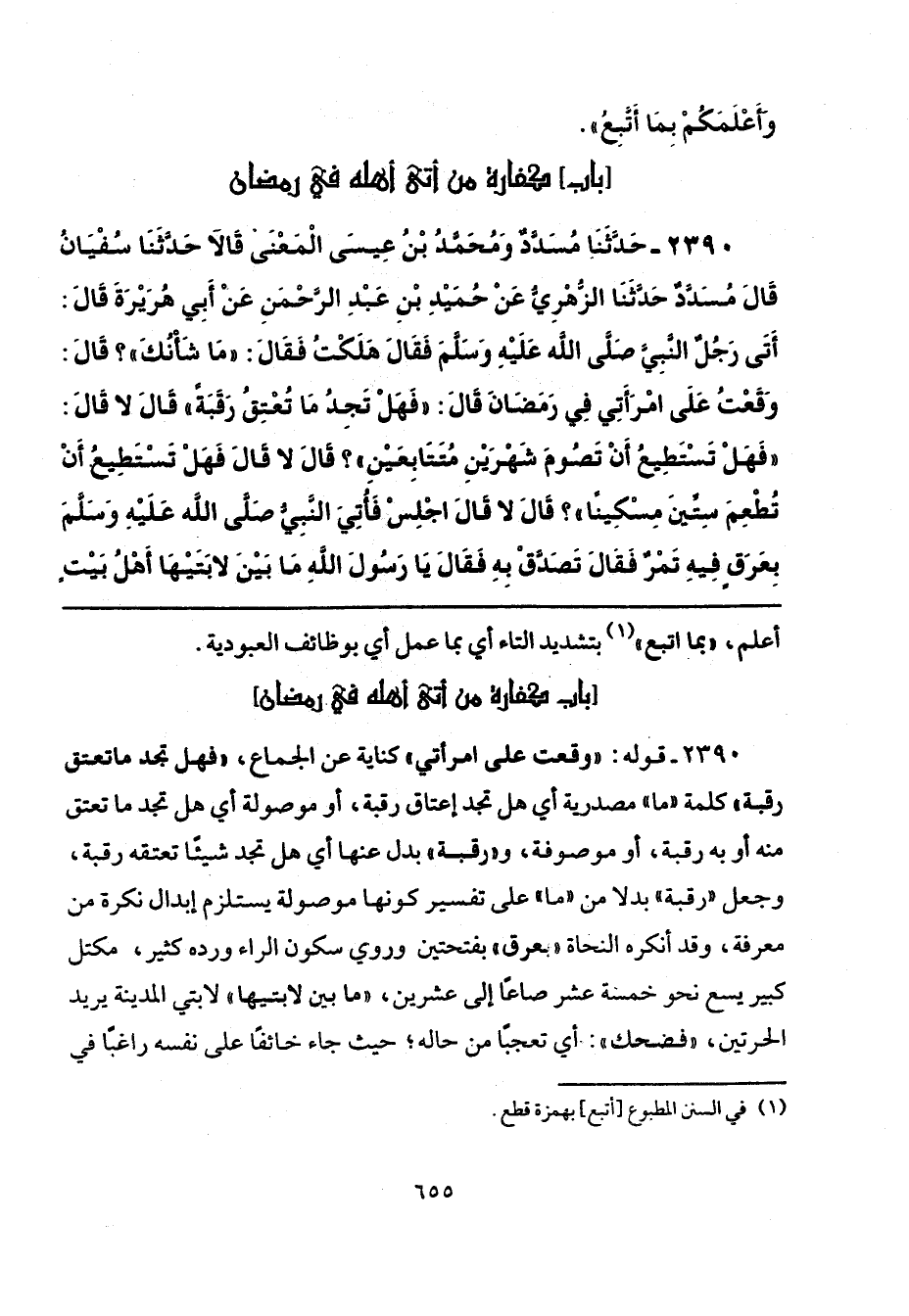 2390 - قوله: "وقعت على امرأتي" كناية عن الجماع؛ "فهل تجد ما تعتق رقبة" كلمة "ما" مصدرية أي هل تجد إعتاق رقية؛ أو موصولة أي هل تجد ما تعتق منه أو به رقبة، أو موصوفة، و"رقبة" بدل عنها أي هل تجد شيئًا تعتقه رقبة، وجعل "رقبة" بدلا من "ما" على تفسير كونها موصولة يستلزم إبدال نكرة من معرفة، وقد أنكره النحاة "بعرق" بفتحتين وروي سكون الراء ورده كثير، مكتل كبير يسع نحو خمسة عشر صاعًا إلى عشرين، "ما بين لابتيها" لابتي المدينة يريد الحرتين، "فضحك": أي تعجبًا من حاله؛ حيث جاء خائفًا على نفسه راغبًا في