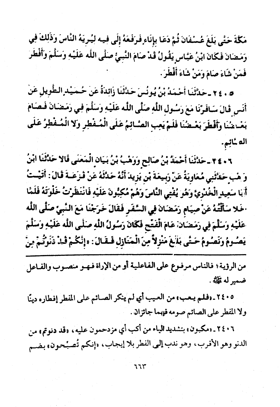 2405 - حَدَّثَنَا أَحْمَدُ بْنُ يُونُسَ، حَدَّثَنَا زَائِدَةُ، عَنْ حُمَيْدٍ الطَّوِيلِ، عَنْ أَنَسٍ قَالَ: «سَافَرْنَا مَعَ رَسُولِ اللَّهِ صَلَّى اللهُ عَلَيْهِ وَسَلَّمَ فِي رَمَضَانَ، فَصَامَ بَعْضُنَا، وَأَفْطَرَ بَعْضُنَا، فَلَمْ يَعِبِ الصَّائِمُ عَلَى الْمُفْطِرِ، وَلَا الْمُفْطِرُ عَلَى الصَّائِمِ».