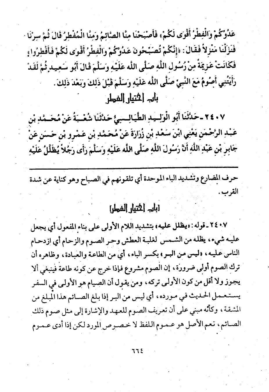 2407 - قوله: "يظلل عليه" بتشديد اللام الأولى على بناء المفعول أي يجعل علية شيء، يظله من الشمس لغلبة العطش وحر الضوم والزحام أي ازدحام الناس عليه، "ليس من البر" بكسر الباء، أي من الطاعة والعبادة، وظاهره أن ترك الصوم أولى ضرورة، إن الصوم مشروع فإذا خرج عن كونه طاعة فينبغي ألا يجوز ولا أقل من كون الأولى تركه، ومن يقول أن الصيام هو الأولى في السفر يستعمل الحديث في مورده، أي ليس من البر إذا بلغ الصائم هذا المبلغ من المشقة، وكأنه مبني على أن تعريف الصوم للعهد والإشارة إلى مثل صوم ذلك الصائم، نعم الأصل هو عموم اللفظ لا خصوص المورد لكن إذا أدى عموم