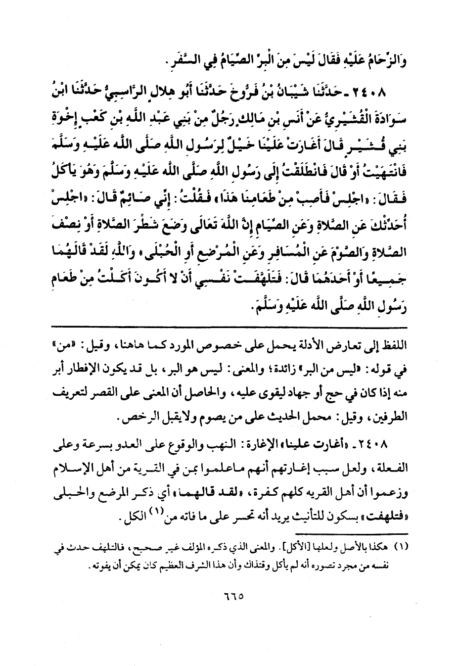 2408 - حَدَّثَنَا شَيْبَانُ بْنُ فَرُّوخَ، حَدَّثَنَا أَبُو هِلَالٍ الرَّاسِبِيُّ، حَدَّثَنَا ابْنُ سَوَادَةَ الْقُشَيْرِيُّ، عَنْ أَنَسِ بْنِ مَالِكٍ، رَجُلٌ مِنْ بَنِي عَبْدِ اللَّهِ بْنِ كَعْبٍ إِخْوَةِ بَنِي قُشَيْرٍ، قَالَ: أَغَارَتْ عَلَيْنَا خَيْلٌ لِرَسُولِ اللَّهِ صَلَّى اللهُ عَلَيْهِ وَسَلَّمَ فَانْتَهَيْتُ، أَوْ قَالَ: فَانْطَلَقْتُ إِلَى رَسُولِ اللَّهِ صَلَّى اللهُ عَلَيْهِ وَسَلَّمَ، وَهُوَ يَأْكُلُ، فَقَالَ: «اجْلِسْ فَأَصِبْ مِنْ طَعَامِنَا هَذَا»، فَقُلْتُ: إِنِّي صَائِمٌ، قَالَ: «اجْلِسْ أُحَدِّثْكَ عَنِ الصَّلَاةِ، وَعَنِ الصِّيَامِ، إِنَّ اللَّهَ تَعَالَى وَضَعَ شَطْرَ الصَّلَاةِ، أَوْ نِصْفَ الصَّلَاةِ وَالصَّوْمَ عَنِ الْمُسَافِرِ، وَعَنِ الْمُرْضِعِ، أَوِ الْحُبْلَى»، وَاللَّهِ لَقَدْ قَالَهُمَا جَمِيعًا أَوْ أَحَدَهُمَا، قَالَ: فَتَلَهَّفَتْ نَفْسِي أَنْ لَا أَكُونَ أَكَلْتُ مِنْ طَعَامِ رَسُولِ اللَّهِ صَلَّى اللهُ عَلَيْهِ وَسَلَّمَ.