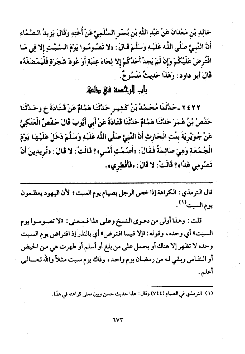 قلت: وهذا أولى من دعوى النسخ وعلى هذا فمعنى: "لا تصوموا يوم السبت" أي وحده، وقوله: "إلا فيما افترض" أي بالنذر إذ افتراض يوم السبت وحده لا تظهر إلا هناك أو يحمل على من بلغ أو أسلم أو طهرت هي من الحيض أو النفاس وبقي له من رمضان يوم واحد، وذاك يوم سبت مثلًا والله تعالى أعلم.