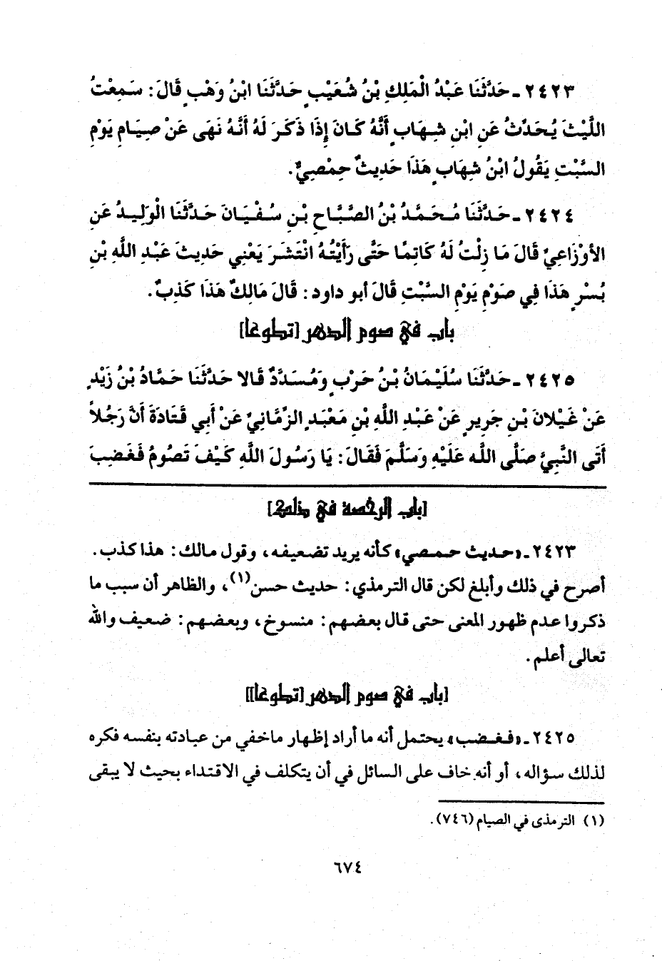 2423 - " حديث حمصي" كأنه يريد تضعيفه، وقول مالك: هذا كذب. أصرح في ذلك وأبلغ لكن قال الترمذي: حديث حسن (¬1)، والظاهر أن سبب ما ذكروا عدم ظهور المعنى حتَّى قال بعضهم: منسوخ، وبعضهم: ضعيف والله تعالى أعلم.