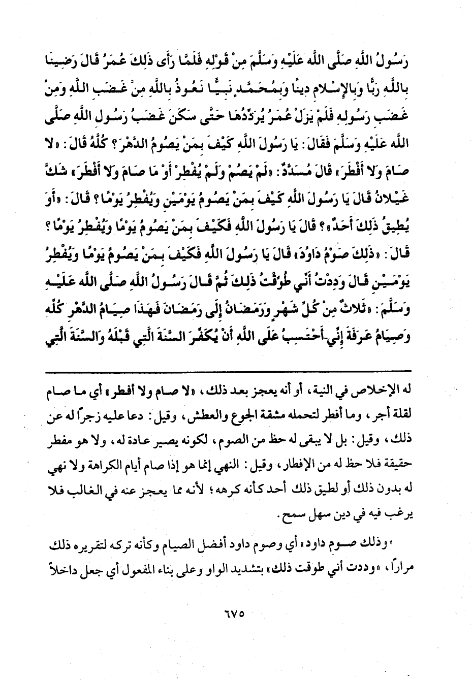 رَسُولُ اللَّهِ صَلَّى اللهُ عَلَيْهِ وَسَلَّمَ مِنْ قَوْلِهِ، فَلَمَّا رَأَى ذَلِكَ عُمَرُ قَالَ: رَضِينَا بِاللَّهِ رَبًّا، وَبِالْإِسْلَامِ دِينًا، وَبِمُحَمَّدٍ نَبِيًّا، نَعُوذُ بِاللَّهِ مِنْ غَضَبِ اللَّهِ، وَمِنْ غَضَبِ رَسُولِهِ، فَلَمْ يَزَلْ عُمَرُ يُرَدِّدُهَا حَتَّى سَكَنَ غَضَبُ رَسُولِ اللَّهِ صَلَّى اللهُ عَلَيْهِ وَسَلَّمَ، فَقَالَ: يَا رَسُولَ اللَّهِ، كَيْفَ بِمَنْ يَصُومُ الدَّهْرَ كُلَّهُ؟ ، قَالَ: «لَا صَامَ وَلَا أَفْطَرَ»، قَالَ مُسَدَّدٌ: «لَمْ يَصُمْ وَلَمْ يُفْطِرْ»، أَوْ «مَا صَامَ وَلَا أَفْطَرَ» - شَكَّ غَيْلَانُ - قَالَ: يَا رَسُولَ اللَّهِ، كَيْفَ بِمَنْ يَصُومُ يَوْمَيْنِ وَيُفْطِرُ يَوْمًا؟ ، قَالَ: «أَوَ يُطِيقُ ذَلِكَ أَحَدٌ؟ »، قَالَ: يَا رَسُولَ اللَّهِ، فَكَيْفَ بِمَنْ يَصُومُ يَوْمًا، وَيُفْطِرُ يَوْمًا؟ ، قَالَ: «ذَلِكَ صَوْمُ دَاوُدَ»، قَالَ: يَا رَسُولَ اللَّهِ، فَكَيْفَ بِمَنْ يَصُومُ يَوْمًا، وَيُفْطِرُ يَوْمَيْنِ؟ قَالَ: وَدِدْتُ أَنِّي طُوِّقْتُ ذَلِكَ، ثُمَّ قَالَ رَسُولُ اللَّهِ صَلَّى اللهُ عَلَيْهِ وَسَلَّمَ: «ثَلَاثٌ مِنْ كُلِّ شَهْرٍ وَرَمَضَانُ إِلَى رَمَضَانَ، فَهَذَا صِيَامُ الدَّهْرِ كُلِّهِ، وَصِيَامُ عَرَفَةَ إِنِّي أَحْتَسِبُ عَلَى اللَّهِ أَنْ يُكَفِّرَ السَّنَةَ الَّتِي قَبْلَهُ، وَالسَّنَةَ الَّتِي