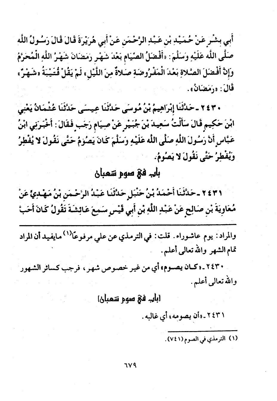 أَبِي بِشْرٍ، عَنْ حُمَيْدِ بْنِ عَبْدِ الرَّحْمَنِ، عَنْ أَبِي هُرَيْرَةَ قَالَ: قَالَ رَسُولُ اللَّهِ صَلَّى اللهُ عَلَيْهِ وَسَلَّمَ: «أَفْضَلُ الصِّيَامِ بَعْدَ شَهْرِ رَمَضَانَ شَهْرُ اللَّهِ الْمُحَرَّمُ، وَإِنَّ أَفْضَلَ الصَّلَاةِ بَعْدَ الْمَفْرُوضَةِ صَلَاةٌ مِنَ اللَّيْلِ»، لَمْ يَقُلْ قُتَيْبَةُ: «شَهْرٌ»، قَالَ «رَمَضَانُ».