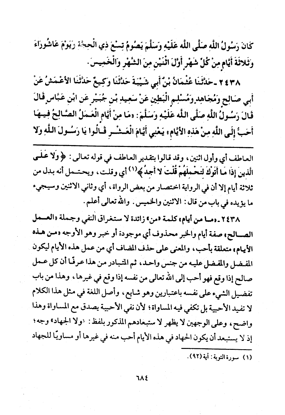 2438 - حَدَّثَنَا عُثْمَانُ بْنُ أَبِي شَيْبَةَ، حَدَّثَنَا وَكِيعٌ، حَدَّثَنَا الْأَعْمَشُ، عَنْ أَبِي صَالِحٍ، وَمُجَاهِدٍ، وَمُسْلِمٍ الْبَطِينِ، عَنْ سَعِيدِ بْنِ جُبَيْرٍ، عَنْ ابْنِ عَبَّاسٍ قَالَ: قَالَ رَسُولُ اللَّهِ صَلَّى اللهُ عَلَيْهِ وَسَلَّمَ: «مَا مِنْ أَيَّامٍ الْعَمَلُ الصَّالِحُ فِيهَا أَحَبُّ إِلَى اللَّهِ مِنْ هَذِهِ الْأَيَّامِ» يَعْنِي أَيَّامَ الْعَشْرِ، قَالُوا: يَا رَسُولَ اللَّهِ، وَلَا