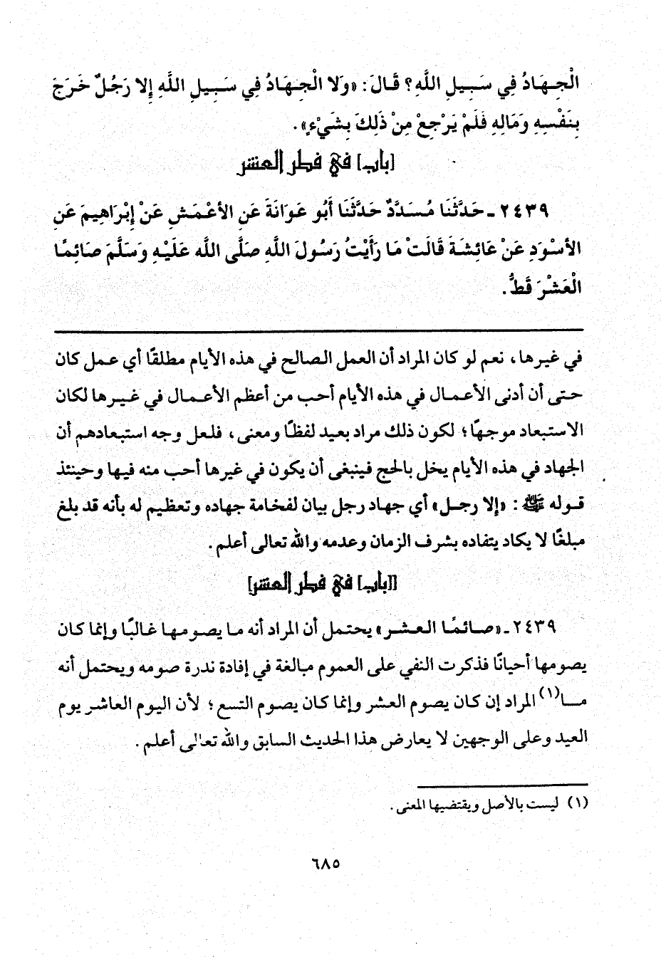 2439 - حَدَّثَنَا مُسَدَّدٌ، حَدَّثَنَا أَبُو عَوَانَةَ، عَنِ الْأَعْمَشِ، عَنْ إِبْرَاهِيمَ، عَنِ الْأَسْوَدِ، عَنْ عَائِشَةَ قَالَتْ: «مَا رَأَيْتُ رَسُولَ اللَّهِ صَلَّى اللهُ عَلَيْهِ وَسَلَّمَ صَائِمًا الْعَشْرَ قَطُّ».