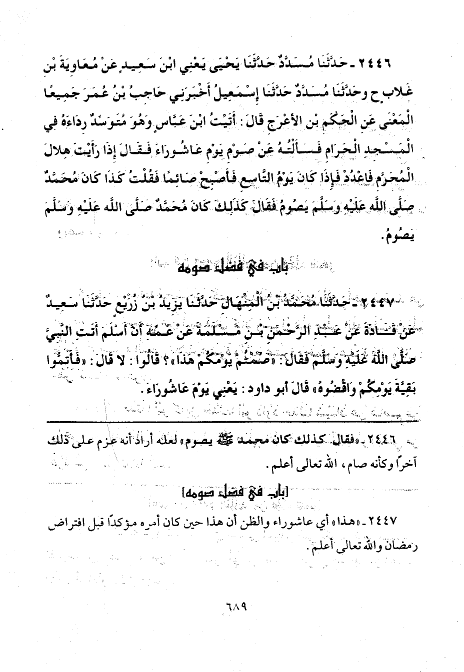 2446 - حَدَّثَنَا مُسَدَّدٌ، حَدَّثَنَا يَحْيَى يَعْنِي ابْنَ سَعِيدٍ، عَنْ مُعَاوِيَةَ بْنِ غَلَّابٍ، ح وحَدَّثَنَا مُسَدَّدٌ، حَدَّثَنَا إِسْمَاعِيلُ، أَخْبَرَنِي حَاجِبُ بْنُ عُمَرَ، جَمِيعًا الْمَعْنَى عَنِ الْحَكَمِ بْنِ الْأَعْرَجِ، قَالَ: أَتَيْتُ ابْنَ عَبَّاسٍ، وَهُوَ مُتَوَسِّدٌ رِدَاءَهُ فِي الْمَسْجِدِ الْحَرَامِ، فَسَأَلْتُهُ عَنْ صَوْمِ يَوْمِ عَاشُورَاءَ، فَقَالَ: إِذَا رَأَيْتَ هِلَالَ الْمُحَرَّمِ، فَاعْدُدْ فَإِذَا كَانَ يَوْمُ التَّاسِعِ، فَأَصْبِحْ صَائِمًا، فَقُلْتُ: كَذَا كَانَ مُحَمَّدٌ صَلَّى اللهُ عَلَيْهِ وَسَلَّمَ يَصُومُ، فَقَالَ: «كَذَلِكَ كَانَ مُحَمَّدٌ صَلَّى اللهُ عَلَيْهِ وَسَلَّمَ يَصُومُ».