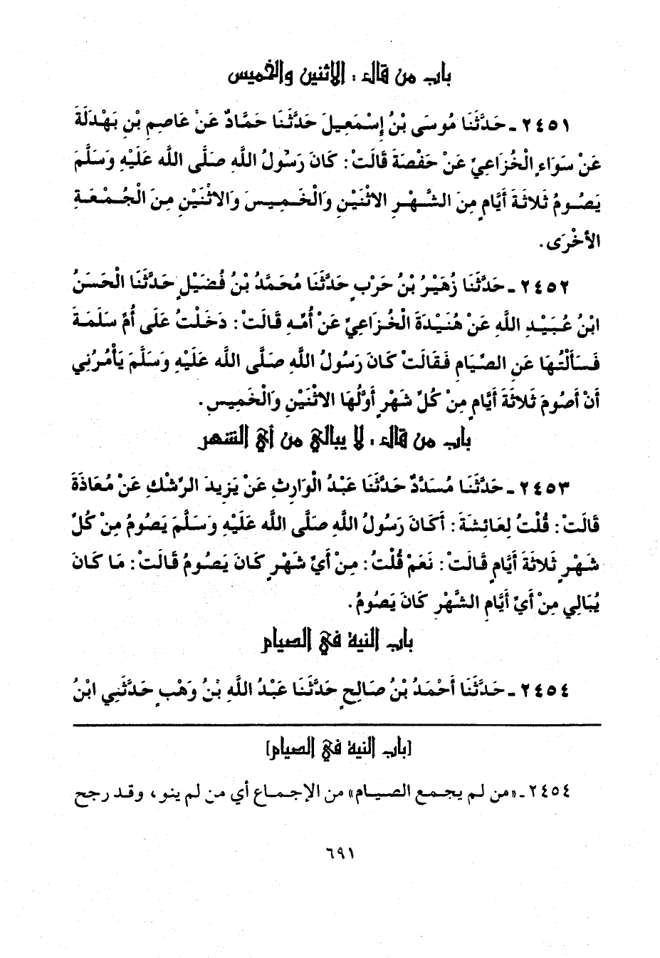 2451 - حَدَّثَنَا مُوسَى بْنُ إِسْمَاعِيلَ، حَدَّثَنَا حَمَّادٌ، عَنْ عَاصِمِ بْنِ بَهْدَلَةَ، عَنْ سَوَاءٍ الْخُزَاعِيِّ، عَنْ حَفْصَةَ قَالَتْ: «كَانَ رَسُولُ اللَّهِ صَلَّى اللهُ عَلَيْهِ وَسَلَّمَ يَصُومُ ثَلَاثَةَ أَيَّامٍ مِنَ الشَّهْرِ الِاثْنَيْنِ وَالْخَمِيسَ، وَالِاثْنَيْنِ مِنَ الْجُمْعَةِ الْأُخْرَى».