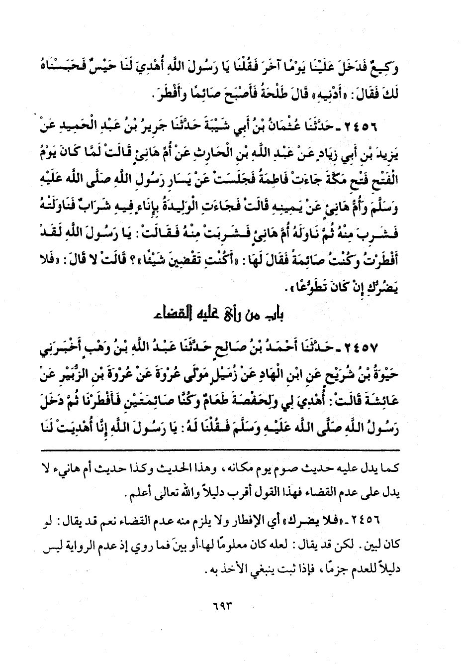 2457 - حَدَّثَنَا أَحْمَدُ بْنُ صَالِحٍ، حَدَّثَنَا عَبْدُ اللَّهِ بْنُ وَهْبٍ، أَخْبَرَنِي حَيْوَةُ بْنُ شُرَيْحٍ، عَنْ ابْنِ الْهَادِ، عَنْ زُمَيْلٍ، مَوْلَى عُرْوَةَ، عَنْ عُرْوَةَ بْنِ الزُّبَيْرِ، عَنْ عَائِشَةَ قَالَتْ: أُهْدِيَ لِي وَلِحَفْصَةَ طَعَامٌ، وَكُنَّا صَائِمَتَيْنِ فَأَفْطَرْنَا، ثُمَّ دَخَلَ رَسُولُ اللَّهِ صَلَّى اللهُ عَلَيْهِ وَسَلَّمَ، فَقُلْنَا لَهُ: يَا رَسُولَ اللَّهِ، إِنَّا أُهْدِيَتْ لَنَا