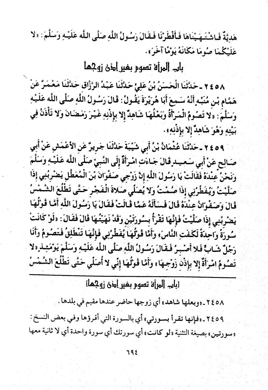 2458 - حَدَّثَنَا الْحَسَنُ بْنُ عَلِيٍّ، حَدَّثَنَا عَبْدُ الرَّزَّاقِ، حَدَّثَنَا مَعْمَرٌ، عَنْ هَمَّامِ بْنِ مُنَبِّهٍ، أَنَّهُ سَمِعَ أَبَا هُرَيْرَةَ يَقُولُ: قَالَ رَسُولُ اللَّهِ صَلَّى اللهُ عَلَيْهِ وَسَلَّمَ: «لَا تَصُومُ الْمَرْأَةُ وَبَعْلُهَا شَاهِدٌ، إِلَّا بِإِذْنِهِ غَيْرَ رَمَضَانَ، وَلَا تَأْذَنُ فِي بَيْتِهِ وَهُوَ شَاهِدٌ إِلَّا بِإِذْنِهِ».
