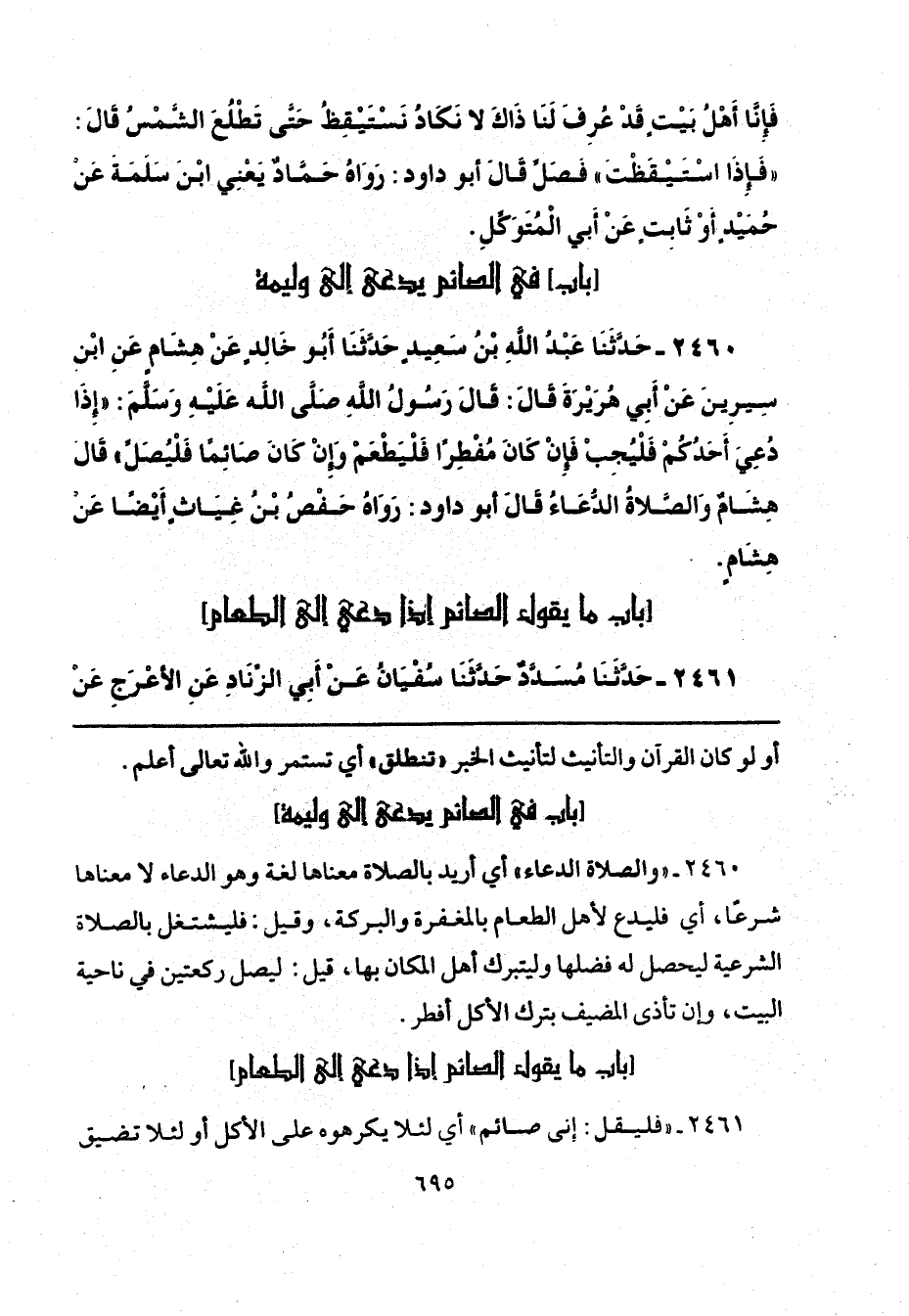 2460 - "والصلاة الدعاء" أي أريد بالصلاة معناها لغة وهو الدعاء لا معناها شرعًا، أي فليدع لأهل الطعام بالمغفرة والبركة، وقيل: فليشتغل بالصلاة الشرعية ليحصل له فضلها وليتبرك أهل المكان بها، قيل: ليصل ركعتين في ناحية البيت، وإن تأذى المضيف بترك الأكل أفطر.