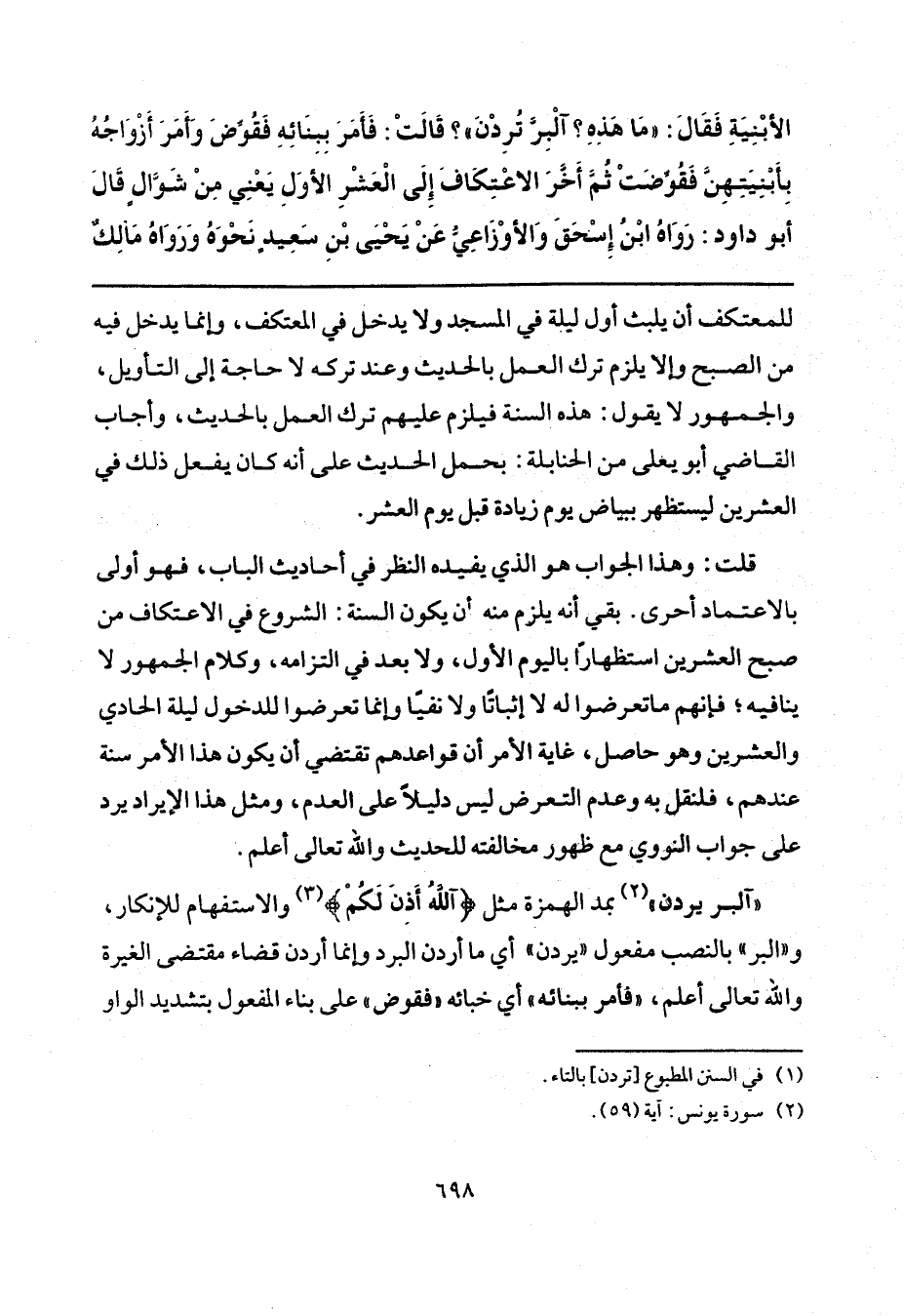 الْأَبْنِيَةِ، فَقَالَ: «مَا هَذِهِ؟ آلْبِرَّ تُرِدْنَ؟ » قَالَتْ: فَأَمَرَ بِبِنَائِهِ فَقُوِّضَ، وَأَمَرَ أَزْوَاجُهُ بِأَبْنِيَتِهِنَّ فَقُوِّضَتْ، ثُمَّ أَخَّرَ الِاعْتِكَافَ إِلَى الْعَشْرِ الْأُوَلِ يَعْنِي مِنْ شَوَّالٍ، قَالَ أَبُو دَاوُدَ: رَوَاهُ ابْنُ إِسْحَاقَ، وَالْأَوْزَاعِيُّ، عَنْ يَحْيَى بْنِ سَعِيدٍ، نَحْوَهُ، وَرَوَاهُ مَالِكٌ،
