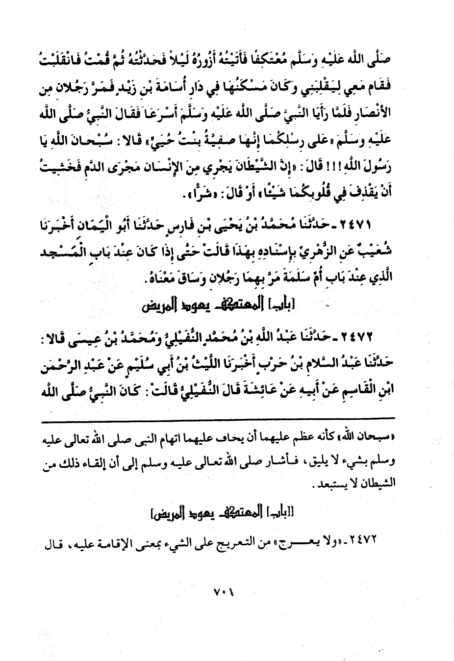 2472 - حَدَّثَنَا عَبْدُ اللَّهِ بْنُ مُحَمَّدٍ النُّفَيْلِيُّ، وَمُحَمَّدُ بْنُ عِيسَى، قَالَا: حَدَّثَنَا عَبْدُ السَّلَامِ بْنُ حَرْبٍ، أَخْبَرَنَا اللَّيْثُ بْنُ أَبِي سُلَيْمٍ، عَنْ عَبْدِ الرَّحْمَنِ بْنِ الْقَاسِمِ، عَنْ أَبِيهِ، عَنْ عَائِشَةَ - قَالَ النُّفَيْلِيُّ - قَالَتْ: «كَانَ النَّبِيُّ صَلَّى اللهُ