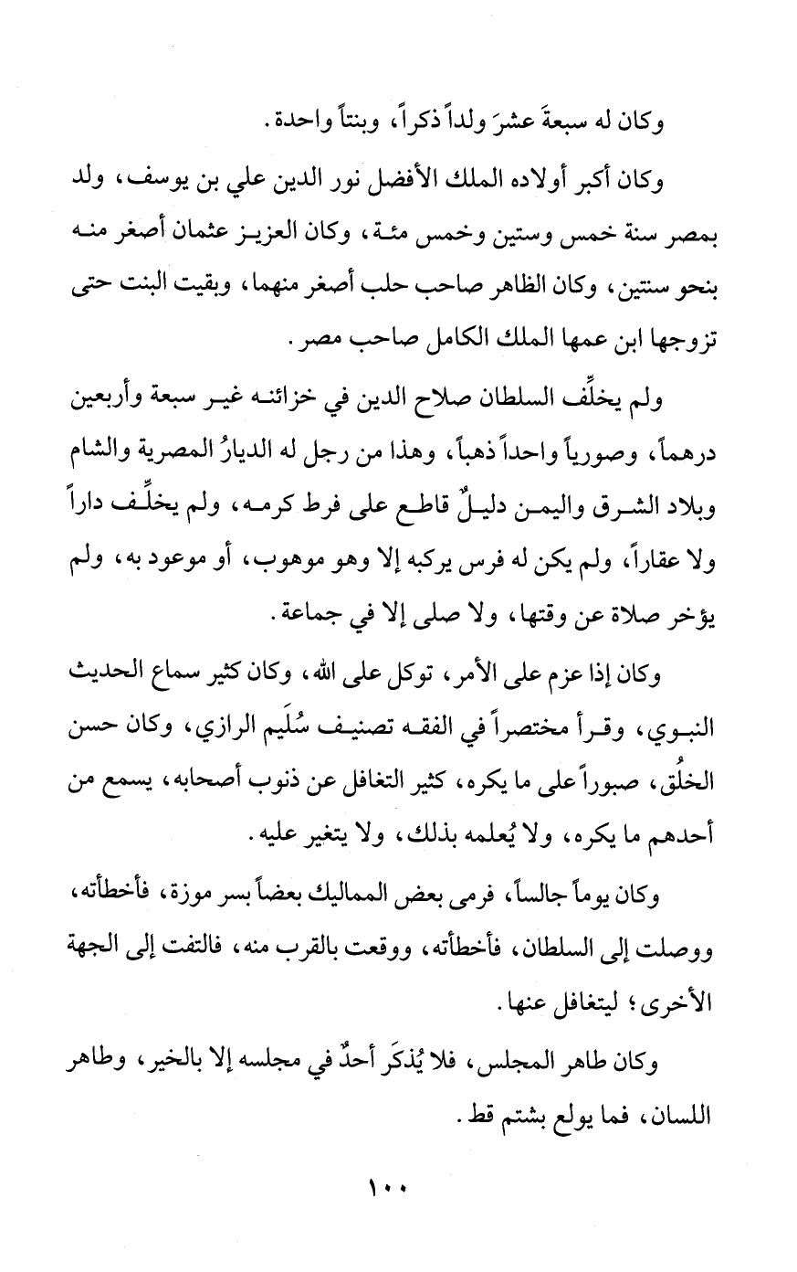 ولم يخلِّف السلطان صلاح الدين في خزائنه غير سبعة وأربعين درهماً، وصورياً واحداً ذهباً، وهذا من رجل له الديارُ المصرية والشام وبلاد الشرق واليمن دليلٌ قاطع على فرط كرمه، ولم يخلِّف داراً ولا عقاراً، ولم يكن له فرس يركبه إلا وهو موهوب، أو موعود به، ولم يؤخر صلاة عن وقتها، ولا صلى إلا في جماعة.