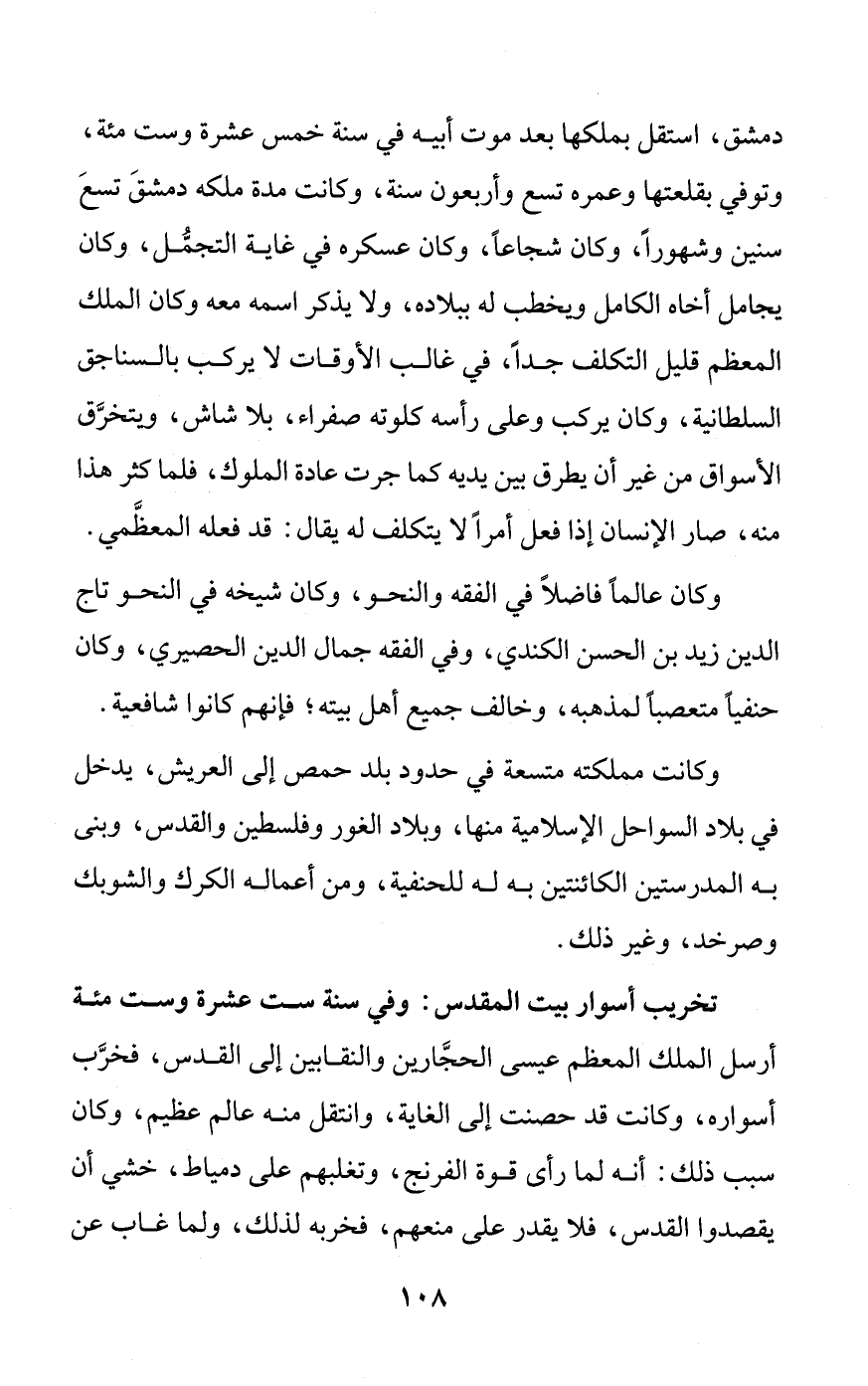 تخريب أسوار بيت المقدس: وفي سنة ست عشرة وست مئة أرسل الملك المعظم عيسى الحجَّارين والنقابين إلى القدس، فخرَّب أسواره، وكانت قد حصنت إلى الغاية، وانتقل منه عالم عظيم، وكان سبب ذلك: أنه لما رأى قوة الفرنج، وتغلبهم على دمياط، خشي أن يقصدوا القدس، فلا يقدر على منعهم، فخربه لذلك، ولما غاب عن