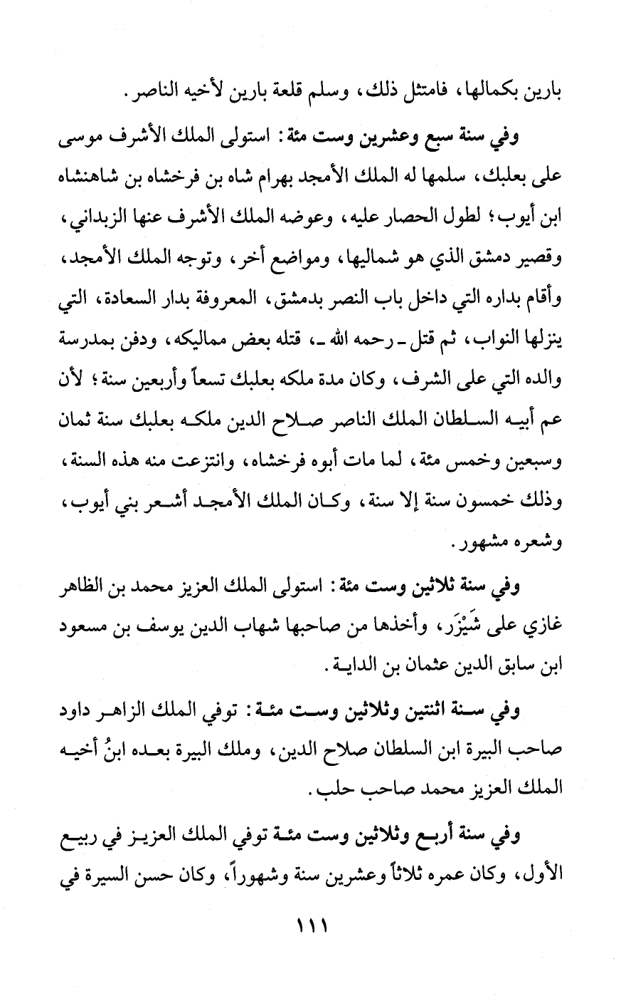 وفي سنة سبع وعشرين وست مئة: استولى الملك الأشرف موسى على بعلبك، سلمها له الملك الأمجد بهرام شاه بن فرخشاه بن شاهنشاه ابن أيوب؛ لطول الحصار عليه، وعوضه الملك الأشرف عنها الزبداني، وقصير دمشق الذي هو شماليها، ومواضع أخر، وتوجه الملك الأمجد، وأقام بداره التي داخل باب النصر بدمشق، المعروفة بدار السعادة، التي ينزلها النواب، ثم قتل - رحمه الله -، قتله بعض ماليكه، ودفن بمدرسة والده التي على الشرف، وكان مدة ملكه بعلبك تسعا وأربعين سنة؛ لأن عم أبيه السلطان الملك الناصر صلاح الدين ملكه بعلبك سنة ثمان وسبعين وخمس مئة، لما مات أبوه فرخشاه، وانتزعت منه هذه السنة، وذلك خمسون سنة إلا سنة، وكان الملك الأمجد أشعر بني أيوب، وشعره مشهور.