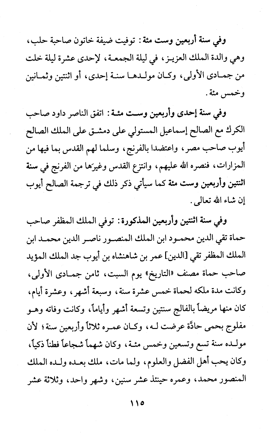 وفي سنة اثنتين وأربعين المذكورة: توفي الملك المظفر صاحب حماة تقي الدين محمود ابن الملك المنصور ناصر الدين محمد ابن الملك المظفر تقي [الدين] عمر بن شاهنشاه بن أيوب جد الملك المؤيد صاحب حماة مصنف "التاريخ" يوم السبت، ثامن جمادى الأولى، وكانت مدة ملكه لحماة خمس عشرة سنة، وسبعة أشهر، وعشرة أيام، كان منها مريضا بالفالج سنتين وتسعة أشهر وأياماً، وكانت وفاته وهو مفلوج بحمى حادَّة عرضت له، وكان عمره ثلاثا وأربعين سنة؛ لأن مولده سنة تسع وتسعين وخمس مئة، وكان شهماً شجاعاً فطناً ذكياً، وكان يحب أهل الفضل والعلوم، ولما مات، ملك بعده ولده الملك المنصور محمد، وعمره حينئذ عشر سنين، وشهر واحد، وثلاثة عشر