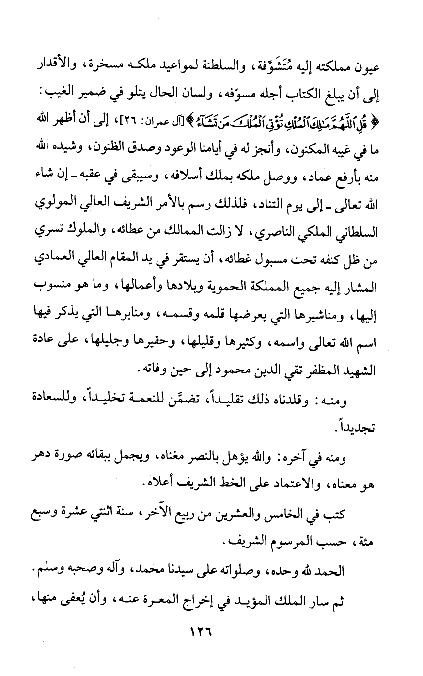 عيون مملكته إليه مُتَشَوِّفة، والسلطنة لمواعيد ملكه مسخرة، والأقدار إلى أن يبلغ الكتاب أجله مسوّفه، ولسان الحال يتلو في ضمير الغيب: {قُلِ اللَّهُمَّ مَالِكَ الْمُلْكِ تُؤْتِي الْمُلْكَ مَنْ تَشَاءُ} [آل عمران: 26]، إلى أن أظهر الله ما في غيبه المكنون، وأنجز له في أيامنا الوعود وصدق الظنون، وشيده الله منه بأرفع عماد، ووصل ملكه بملك أسلافه، وسيبقى في عقبه - إن شاء الله تعالى - إلى يوم التناد، فلذلك رسم بالأمر الشريف العالي المولوي السلطاني الملكي الناصري، لا زالت الممالك من عطائه، والملوك تسري من ظل كنفه تحت مسبول غطائه، أن يستقر في يد المقام العالي العمادي المشار إليه جميع المملكة الحموية وبلادها وأعمالها، وما هو منسوب إليها، ومناشيرها التي يعرضها قلمه وقسمه، ومنابرها التي يذكر فيها اسم الله تعالى واسمه، وكثيرها وقليلها، وحقيرها وجليلها، على عادة الشهيد المظفر تقي الدين محمود إلى حين وفاته.