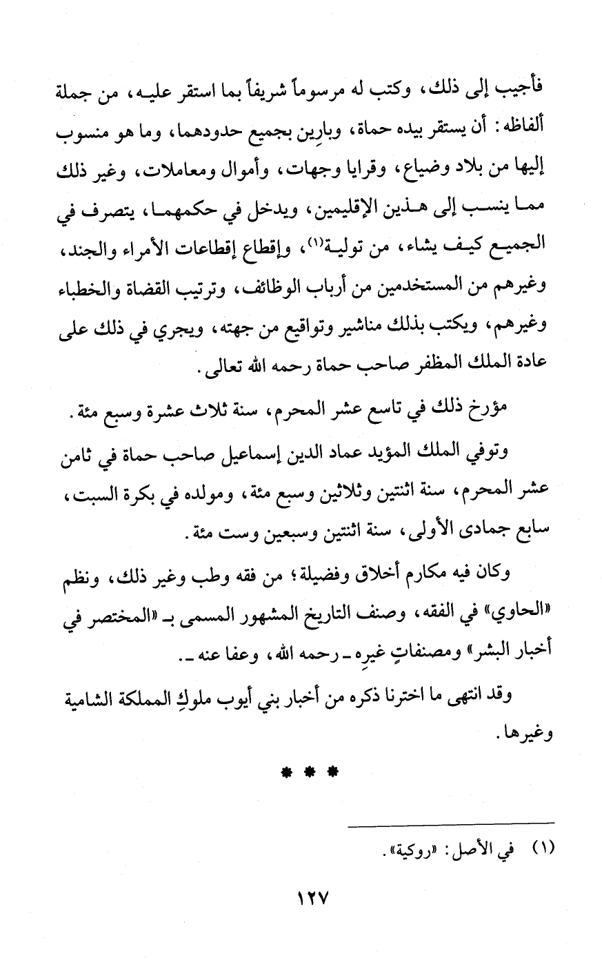 وتوفي الملك المؤيد عماد الدين إسماعيل صاحب حماة في ثامن عشر المحرم، سنة اثنتين وثلاثين وسبع مئة، ومولده في بكرة السبت، سابم جمادى الأولى، سنة اثنتين وسبعين وست مئة.