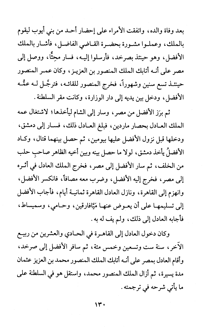 وكان دخول العادل إلى القاهرة في الحادي والعشرين من ربيع الآخر، سنة ست وتسعين وخمس مئة، ثم سافر الأفضل إلى صرخد، وأقام العادل بمصر على أنه أتابك الملك المنصور محمد بن العزيز عثمان مدة يسيرة، ثم أزال الملك المنصور محمد، واستقل هو في السلطنة على ما يأتي شرحه في ترجمته.