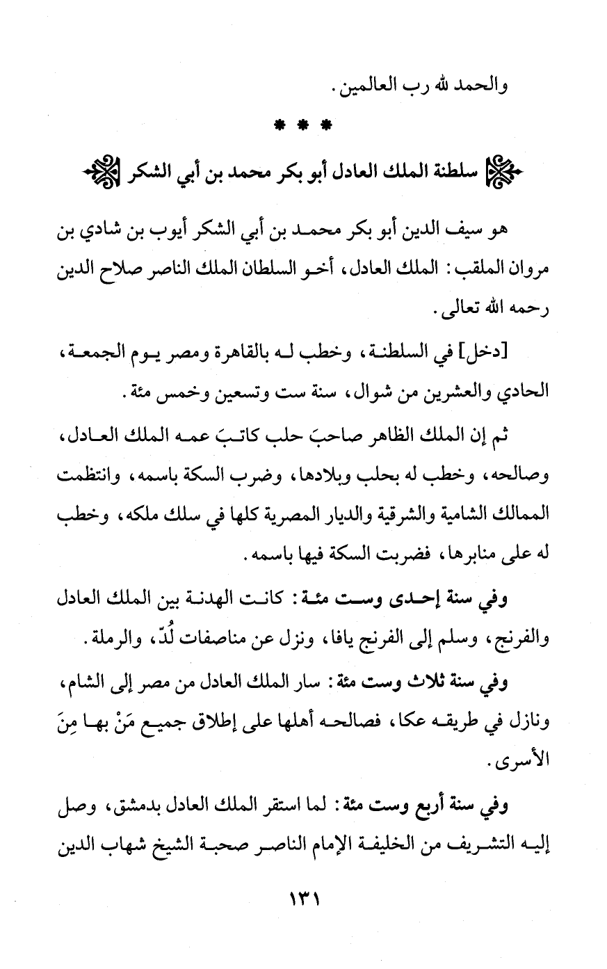 هو سيف الدين أبو بكر محمد بن أبي الشكر أيوب بن شادي بن مروان الملقب: الملك العادل، أخو السلطان الملك الناصر صلاح الدين رحمه الله تعالى.