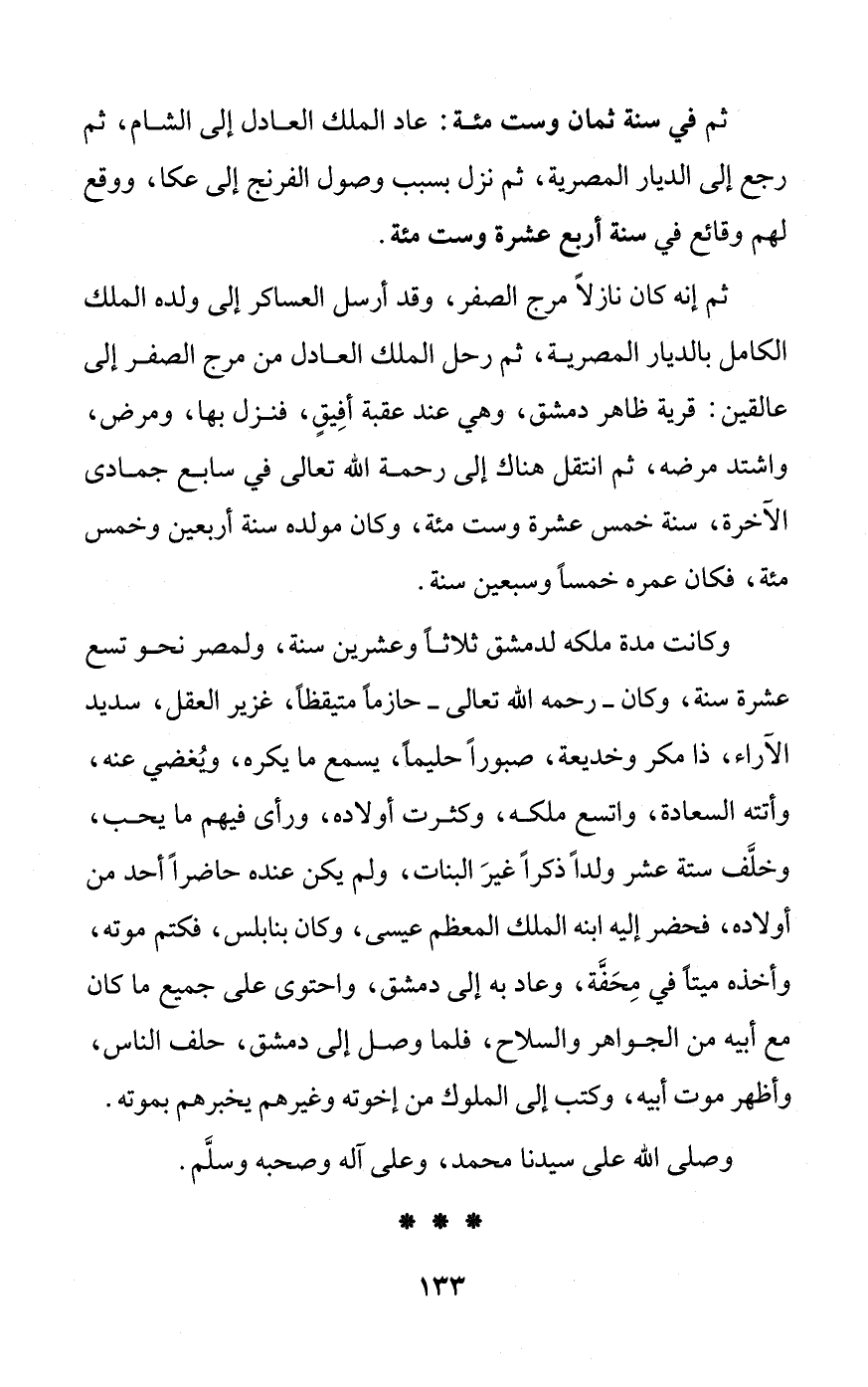 وكانت مدة ملكه لدمشق ثلاثاً وعشرين سنة، ولمصر نحو تسع عشرة سنة، وكان - رحمه الله تعالى - حازماً متيقظاً، غزير العقل، سديد الآراء، ذا مكر وخديعة، صبوراً حليما، يسمع ما يكره، ويُغضي عنه، وأتته السعادة، واتسع ملكه، وكثرت أولاده، ورأى فيهم ما يحب، وخلَّف ستة عشر ولداً ذكراً غيرَ البنات، ولم يكن عنده حاضراً أحد من أولاده، فحضر إليه ابنه الملك المعظم عيسى، وكان بنابلس، فكتم موته، وأخذه ميتاً في مِحَفَّة، وعاد به إلى دمشق، واحتوى على جميع ما كان مع أبيه من الجواهر والسلاح، فلما وصل إلى دمشق، حلف الناس، وأظهر موت أبيه، وكتب إلى الملوك من إخوته وغيرهم يخبرهم بموته.