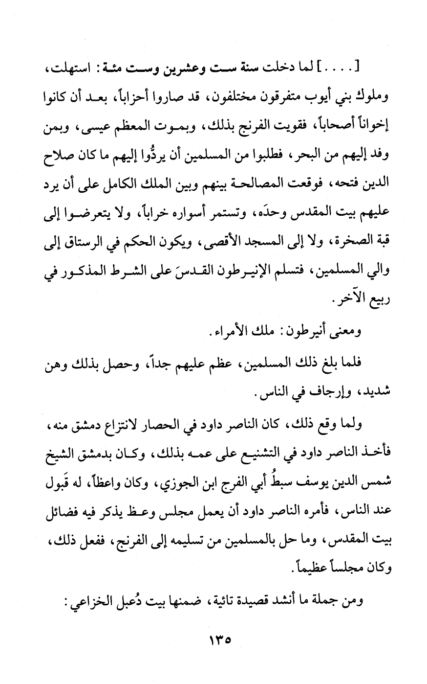 [ ... .] لما دخلت سنة ست وعشرين وست مئة: استهلت، وملوك بني أيوب متفرقون مختلفون، قد صاروا أحزاباً، بعد أن كانوا إخواناً أصحاباً، فقويت الفرنج بذلك، وبموت المعظم عيسى، وبمن وفد إليهم من البحر، فطلبوا من المسلمين أن يردُّوا إليهم ما كان صلاح الدين فتحه، فوقعت المصالحة بينهم وبين الملك الكامل على أن يرد عليهم بيت المقدس وحدَه، وتستمر أسواره خراباً، ولا يتعرضوا إلى قبة الصخرة، ولا إلى المسجد الأقصى، ويكون الحكم في الرستاق إلى والي المسلمين، فتسلم الإنيرطون القدسَ على الشرط المذكور في ربيع الآخر.