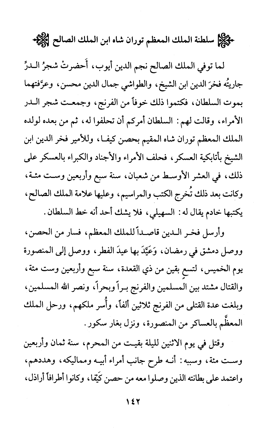 لما توفي الملك الصالح نجم الدين أيوب، أَحضرتْ شجرُ الدرِّ جاريتُه فخرَ الدين ابن الشيخ، والطواشي جمال الدين محسن، وعرَّفتهما بموت السلطان، فكتموا ذلك خوفاً من الفرنج، وجمعت شجر الدر الأمراء، وقالت لهم: السلطان أمركم أن تحلفوا له، ثم من بعده لولده الملك المعظم توران شاه المقيم بحصن كيفا، وللأمير فخر الدين ابن الشيخ بأتابكية العسكر، فحلف الأمراء والأجناد والكبراء بالعسكر على ذلك، في العشر الأوسط من شعبان، سنة سبع وأربعين وست مئة، وكانت بعد ذلك تُخرج الكتب والمراسيم، وعليها علامة الملك الصالح، يكتبها خادم يقال له: السهيلي، فلا يشك أحد أنه خط السلطان.