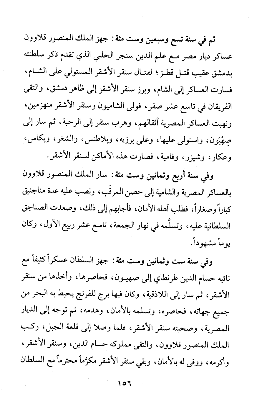 وفي سنة أربع وثمانين وست مئة: سار الملك المنصور قلاوون بالعساكر المصرية والشامية إلى حصن المرقَب، ونصب عليه عدة مناجنيق كباراً وصغاراً، فطلب أهله الأمان، فأجابهم إلى ذلك، وصعدت الصناجق السلطانية عليه، وتسلَّمه في نهار الجمعة، تاسع عشر ربيع الأول، وكان يوما مشهوداً.