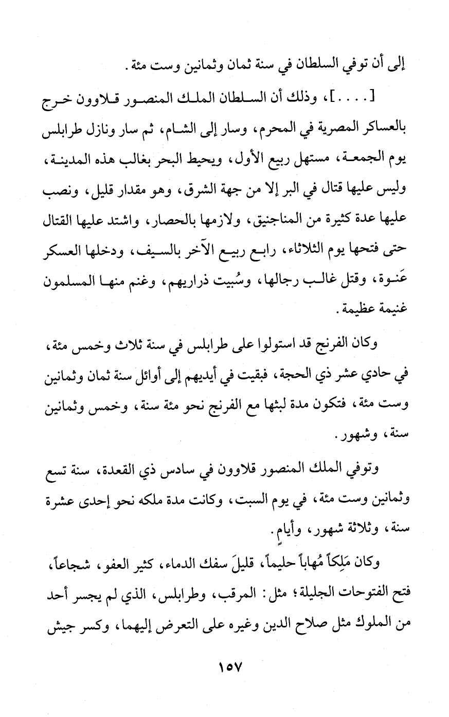 [ ... .]، وذلك أن السلطان الملك المنصور قلاوون خرج بالعساكر المصرية في المحرم، وسار إلى الشام، ثم سار ونازل طرابلس يوم الجمعة، مستهل ربيع الأول، ويحيط البحر بغالب هذه المدينة، وليس عليها قتال في البر إلا من جهة الشرق، وهو مقدار قليل، ونصب عليها عدة كثيرة من المناجنيق، ولازمها بالحصار، واشتد عليها القتال حتى فتحها يوم الثلاثاء، رابع ربيع الآخر بالسيف، ودخلها العسكر عَنوة، وقتل غالب رجالها، وسُبيت ذراريهم، وغنم منها المسلمون غنيمة عظيمة.