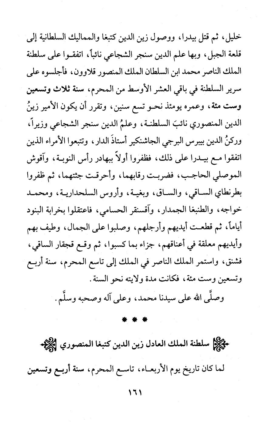 خليل، ثم قتل بيدرا، ووصول زين الدين كتبغا والمماليك السلطانية إلى قلعة الجبل، وبها علم الدين سنجر الشجاعي نائبًا، اتفقوا على سلطنة الملك الناصر محمد ابن السلطان الملك المنصور قلاوون، فأجلسوه على سرير السلطنة في باقي العشر الأوسط من المحرم، سنة ثلاث وتسعين وست مئة، وعمره يومئذ نحو تسع سنين، وتقرر أن يكون الأمير زينُ الدين المنصوري نائبَ السلطنة، وعلمُ الدين سنجر الشجاعي وزيرًا، وركنُ الدين بيبرس البرجي الجاشنكير أستاذَ الدار، وتتبعوا الأمراء الذين اتفقوا مع بيدرا على ذلك، فظفروا أولًا ببهادر رأس النوبة، وآقوش الموصلي الحاجب، فضربت رقابهما، وأحرقت جثتهما، ثم ظفروا بطرنطاي الساقي، والساق، وبغية، وأروس السلحدارية، ومحمد خواجه، والطنبغا الجمدار، وآقسنقر الحسامي، فاعتقلوا بخرابة البنود أيامًا، ثم قطعت أيديهم وأرجلهم، وصلبوا على الجمال، وطيف بهم وأيديهم معلقة في أعناقهم، جزاء بما كسبوا، ثم وقع قجقار الساقي، فشنق، واستمر الملك الناصر في الملك إلى تاسع المحرم، سنة أربع وتسعين وست مئة، فكانت مدة ولايته نحو السنة.