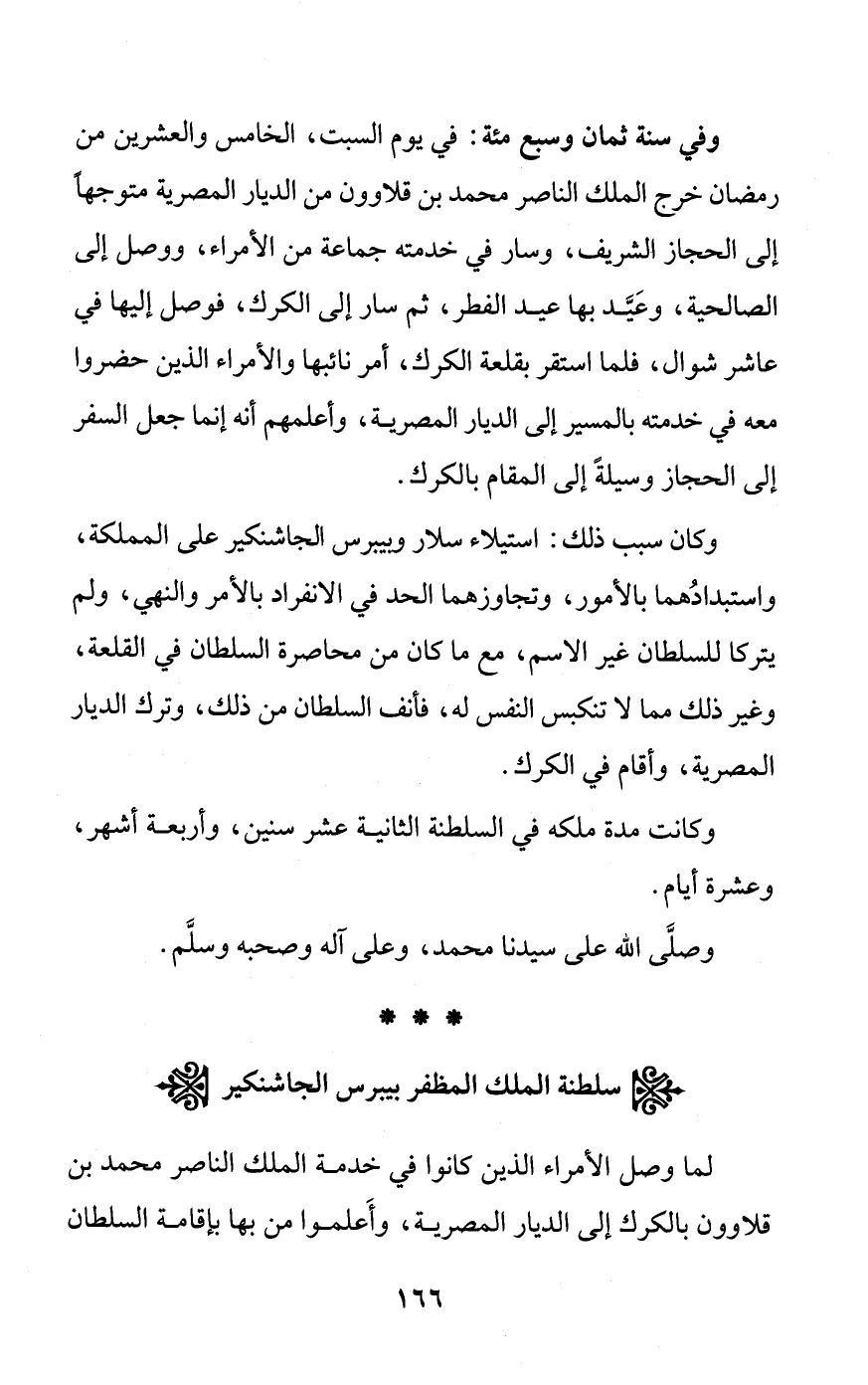 وفي سنة ثمان وسبع مئة: في يوم السبت، الخامس والعشرين من رمضان خرج الملك الناصر محمد بن قلاوون من الديار المصرية متوجهًا إلى الحجاز الشريف، وسار في خدمته جماعة من الأمراء، ووصل إلى الصالحية، وعَيَّد بها عيد الفطر، ثم سار إلى الكرك، فوصل إليها في عاشر شوال، فلما استقر بقلعة الكرك، أمر نائبها والأمراء الذين حضروا معه في خدمته بالمسير إلى الديار المصرية، وأعلمهم أنه إنما جعل السفر إلى الحجاز وسيلةً إلى المقام بالكرك.