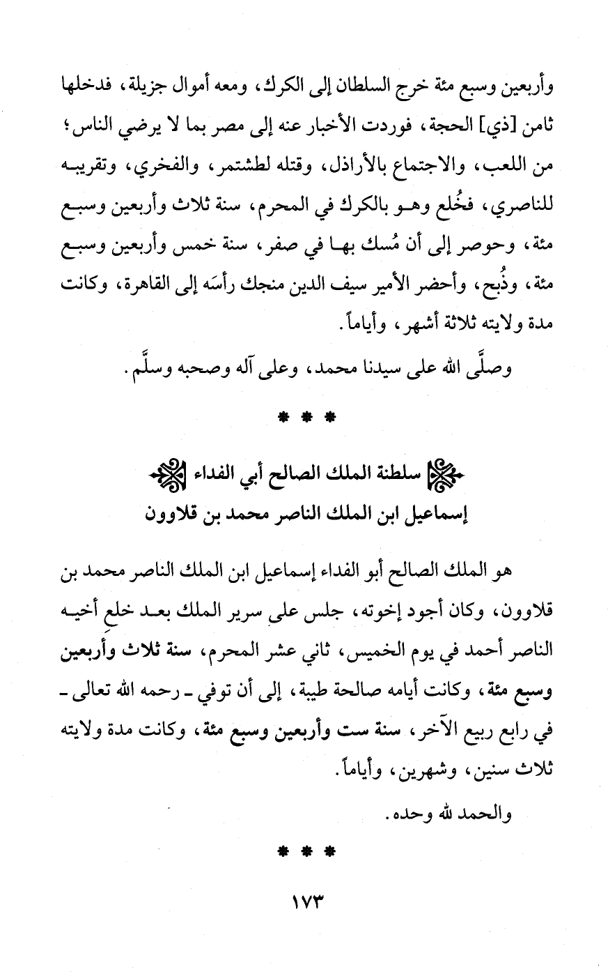 هو الملك الصالح أبو الفداء إسماعيل ابن الملك الناصر محمد بن قلاوون، وكان أجود إخوته، جلس على سرير الملك بعد خلعِ أخيه الناصر أحمد في يوم الخميس، ثاني عشر المحرم، سنة ثلاث وأربعين وسبع مئة، وكانت أيامه صالحة طيبة، إلى أن توفي - رحمه الله تعالى - في رابع ربيع الآخر، سنة ست وأربعين وسبع مئة، وكانت مدة ولايته ثلاث سنين، وشهرين، وأيامًا.