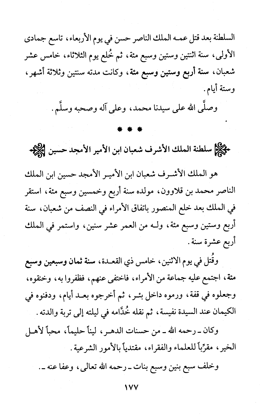 هو الملك الأشرف شعبان ابن الأمير الأمجد حسين ابن الملك الناصر محمد بن قلاوون، مولده سنة أربع وخمسين وسبع مئة، استقر في الملك بعد خلع المنصور باتفاق الأمراء في النصف من شعبان، سنة أربع وستين وسبع مئة، وله من العمر عشر سنين، واستمر في الملك أربع عشرة سنة.