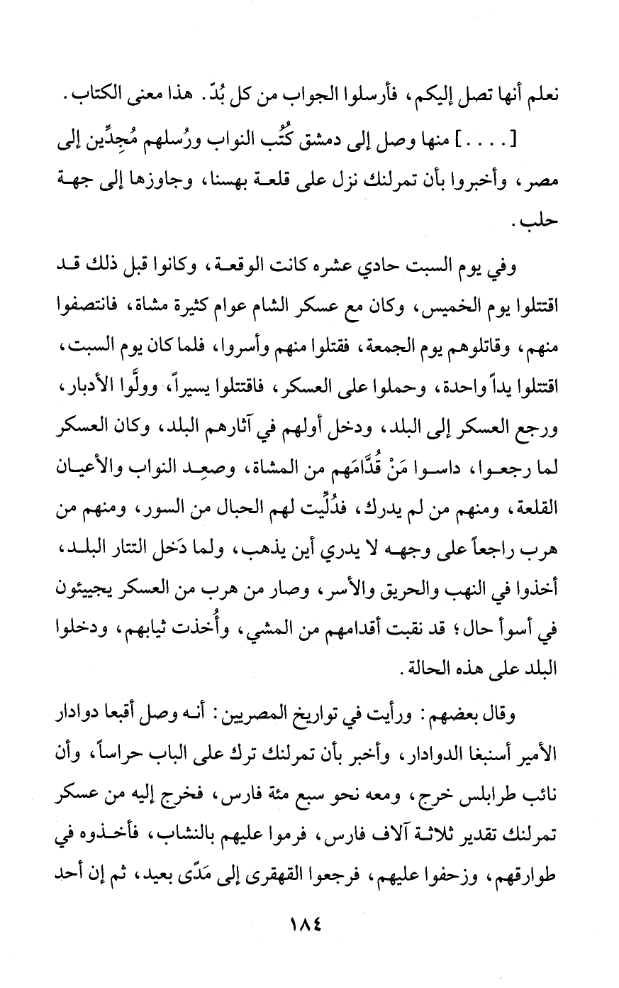 [ .... ] منها وصل إلى دمشق كُتُب النواب ورُسلهم مُجِدِّين إلى مصر، وأخبروا بأن تمرلنك نزل على قلعة بهسنا، وجاوزها إلى جهة حلب.