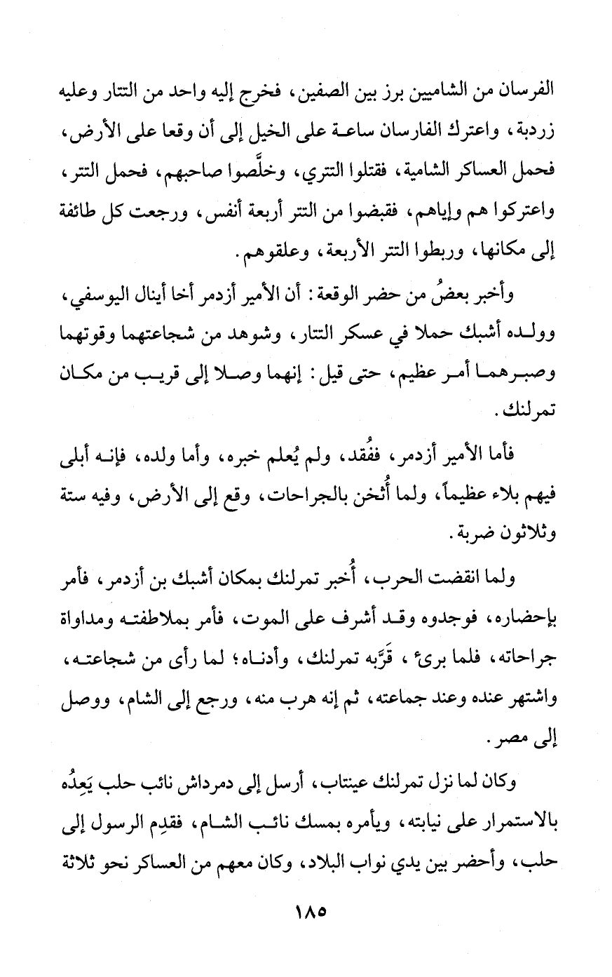 الفرسان من الشاميين برز بين الصفين، فخرج إليه واحد من التتار وعليه زردبة، واعترك الفارسان ساعة على الخيل إلى أن وقعا على الأرض، فحمل العساكر الشامية، فقتلوا التتري، وخلَّصوا صاحبهم، فحمل التتر، واعتركوا هم وإياهم، فقبضوا من التتر أربعة أنفس، ورجعت كل طائفة إلى مكانها، وربطوا التتر الأربعة، وعلقوهم.
