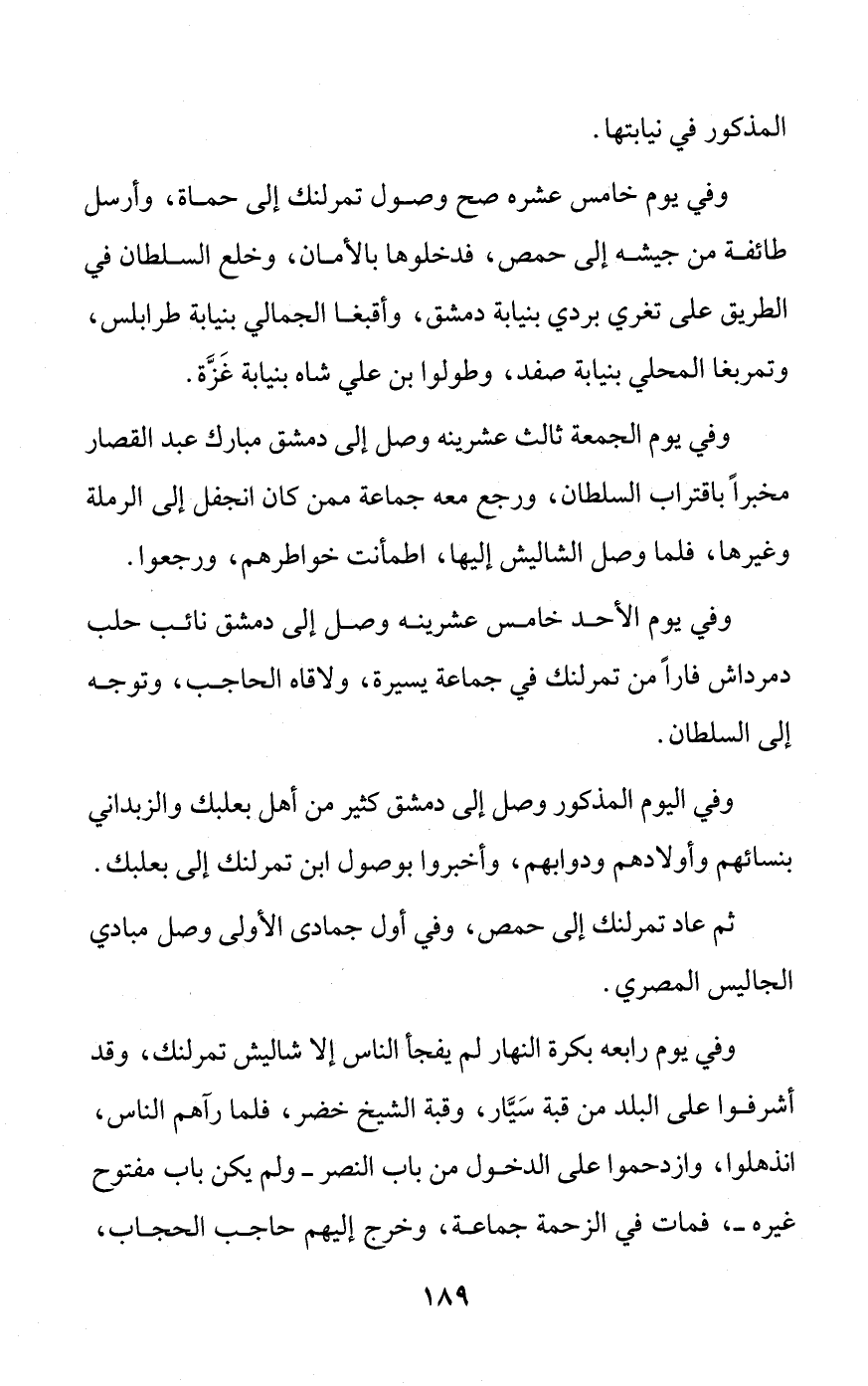 وفي يوم الأحد خامس عشرينه وصل إلى دمشق نائب حلب دمرداش فارًا من تمرلنك في جماعة يسيرة، ولاقاه الحاجب، وتوجه إلى السلطان.